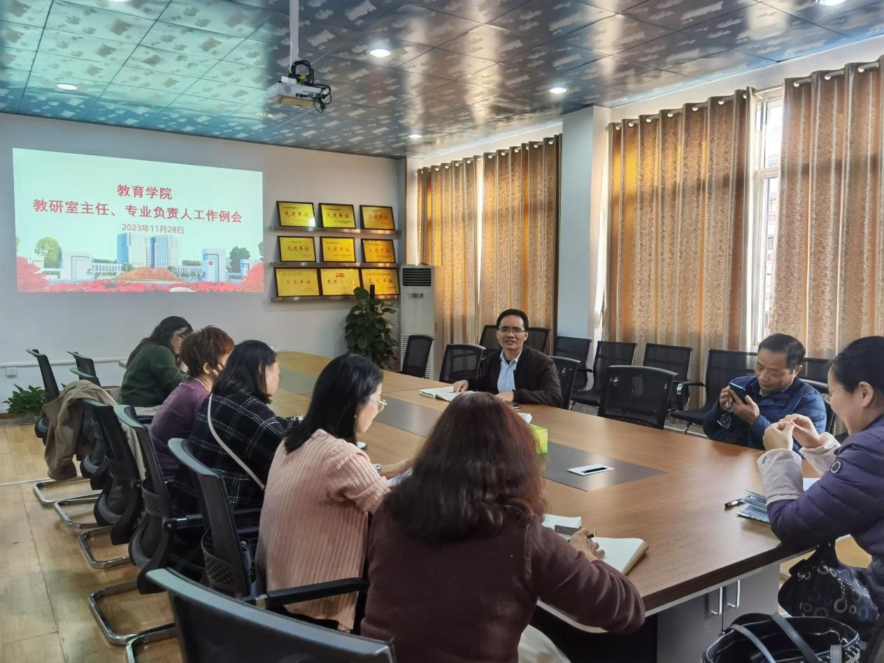 11月29日下午,教育学院在三楼会议室召开了教研室主任、专业负责人工作例会。会议由学院副院长于文军主持,学院各专业负责人、教研室主任、教务科工作人员参加会议。