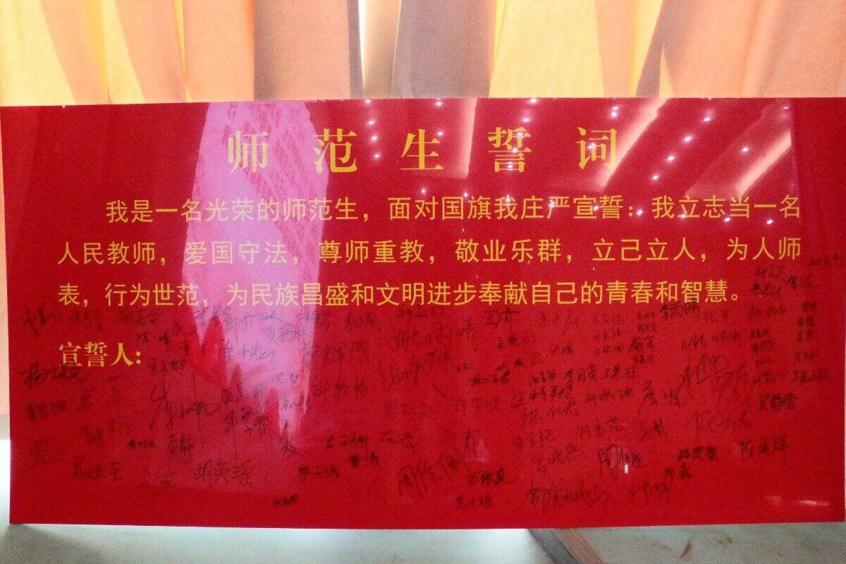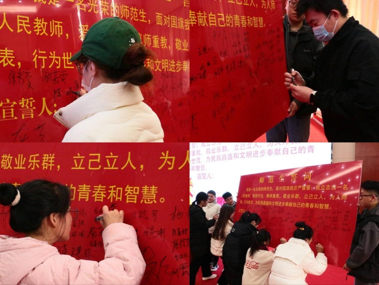 接着,全体师范生在学生代表王文超同学的带领下庄严宣誓,并在宣誓结束后在师范生宣誓词墙上签名。党委副书记周光培对实习过程的安全工作进行了强调,他指出安全是一切活动的基础,是一切活动的前提,是不可超越的先决条件,希望同学们要始终把“安全第一”放到首位,将安全落实到教育实习中的每一个环节中去。他提醒同学们要遵守各项规章制度,遵守国家法律法规和校纪校规;要学会释放压力,遇到问题要及时沟通;要注意防诈骗问题,仔细辨别各类信息;要注意自身的财产安全、交通安全、人身安全,在防溺水及住房等方面要提高警惕性。副院长梁尔铭就教育实习提出三点希望:一是要服从实习安排,珍惜这次实习机会;二要服从学校的工作安排,注重课程的讲授工作与班主任实习工作;三要合理规划时间,做到教育实习和备考工作两不误。