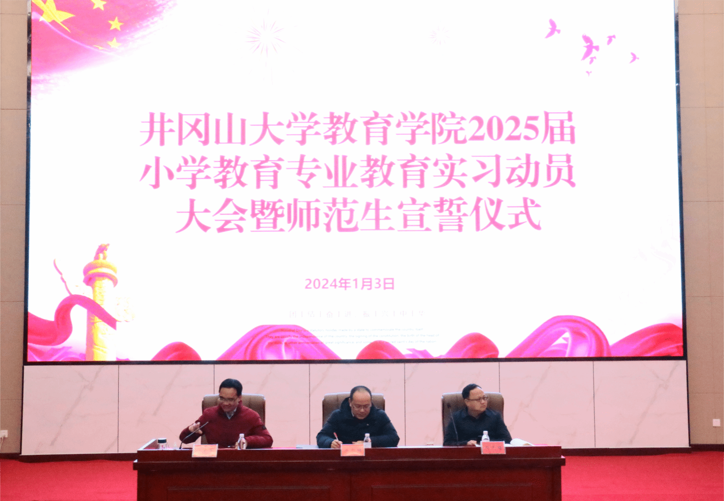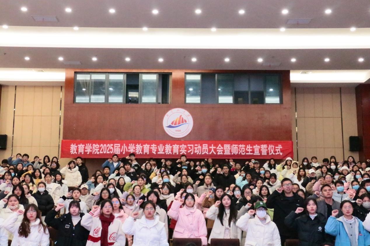 为了提高学生们的实践教学水平、增强自身专业综合素质,锻炼其成为一名优秀的人民教师,教育学院于1月3日上午在图书馆学术报告厅举行2025届小学教育专业教育实习动员大会暨师范生宣誓仪式。教育学院副院长梁尔铭、党委副书记周光培、教务科负责人李小芳和小学教育专业教师等出席本次大会,2025届小学教育专业全体师范学生到场参加,仪式由副院长于文军主持。