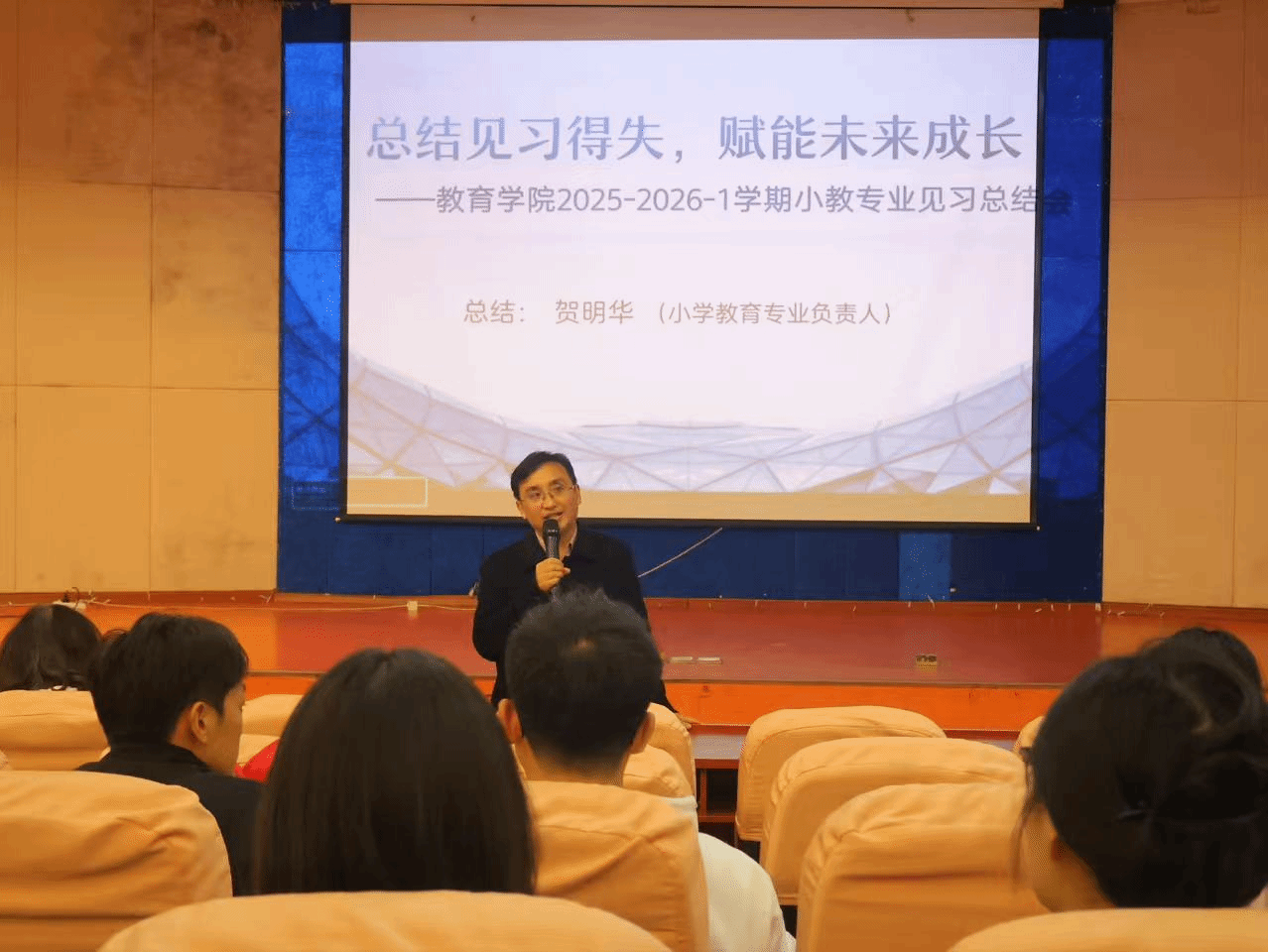 10 月 17 日,教育学院 2023 级(专升本)小学教育专业学生见习活动顺利收官。为系统梳理见习成果、提炼实践经验、补齐能力短板,进一步提升人才培养质量,11 月 5 日晚,学院于10栋学术报告厅隆重召开见习总结大会。大会由教育学教研室主任周莹华主持,小学教育专业负责人、见习带教教师代表、全体见习学生及相关班主任共200余人齐聚现场,共话见习收获,共绘成长蓝图。