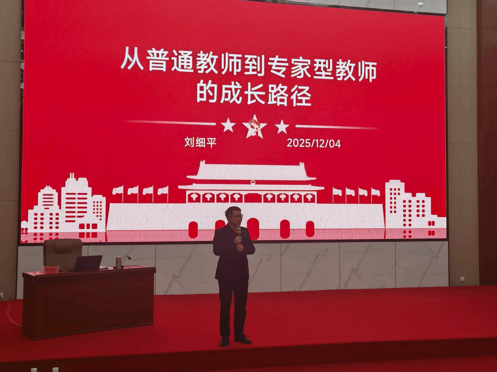 “把每节课备到极致,把每个学生放在心上”,刘经标以自身 “从师范生到骨干教师” 的成长轨迹为脉络,分享了扎根教育一线的实践经验。他结合从教以来的真实案例,生动诠释了教育工作者的责任与担当,用 “坚守讲台,方见教育真味” 的深切感悟,传递出对教育事业的赤诚初心,鼓励学子们以热爱为舟,在教育之路上稳步前行。