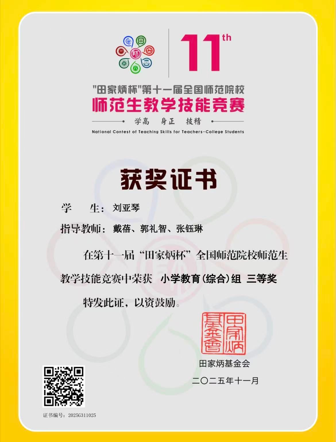 在第十一届 “田家炳杯” 全国师范院校师范生教学技能竞赛初赛中,我院 2022 级小学教育专业学生刘亚琴,在戴蓓、郭礼智、张钰琳三位老师的悉心指导下,凭借扎实的师范素养与出色的教学表现,成功斩获三等奖!