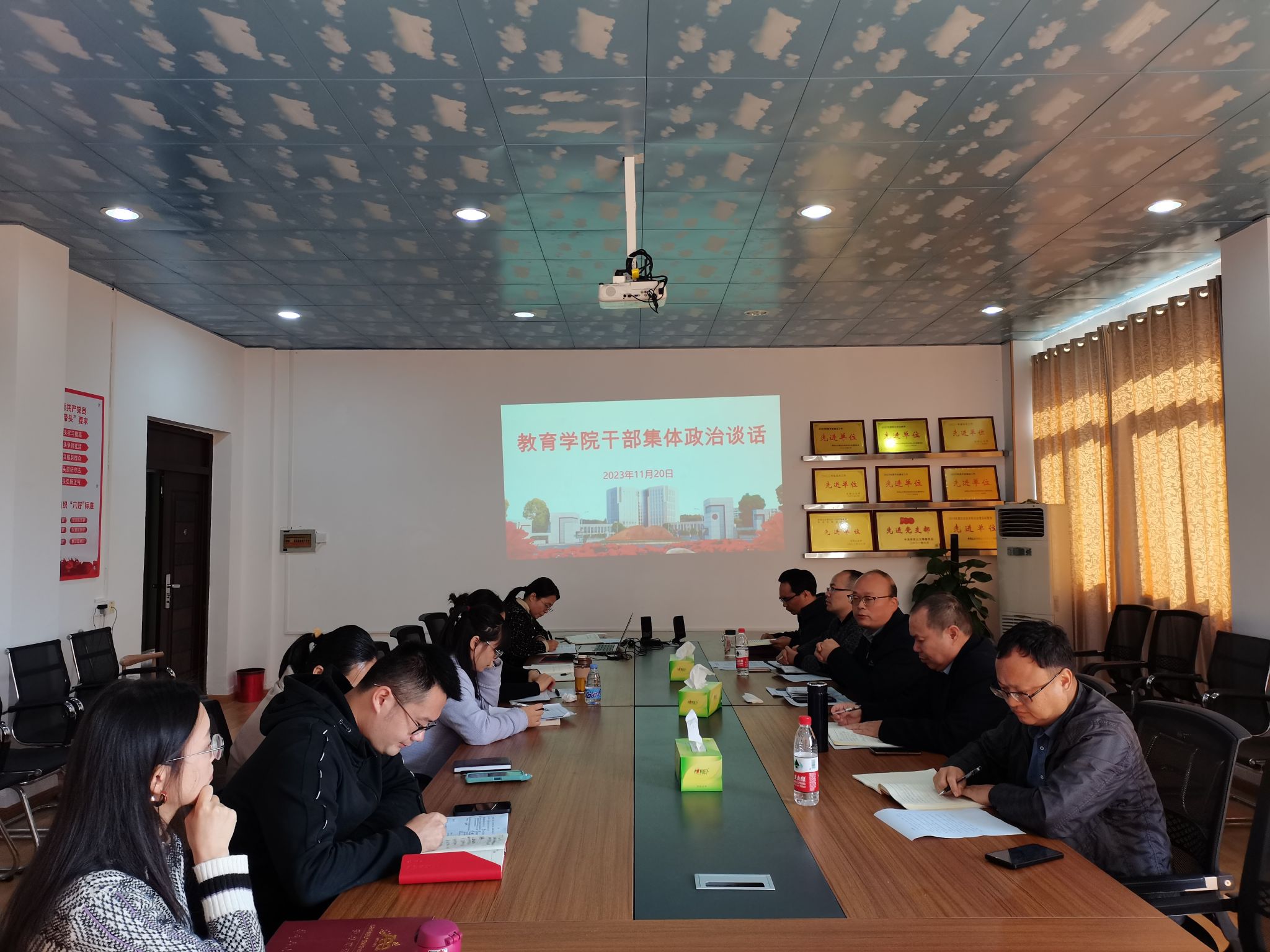 11月20日上午,教育学院在3栋三楼会议室开展党员干部集体政治谈话,院党委书记曾学锋主持并讲话,院长胡忠光、副书记周光培、副院长梁尔铭、于文军和各科室负责人、辅导员和管理人员参会。