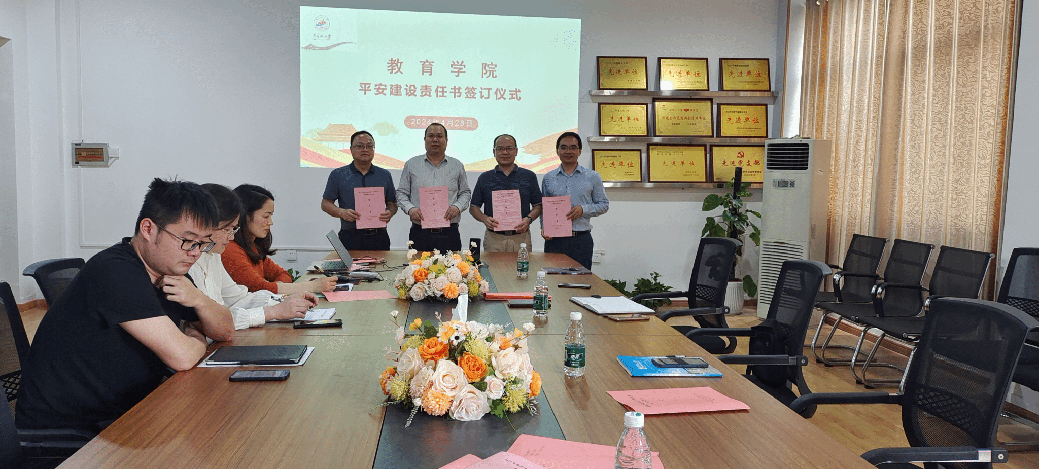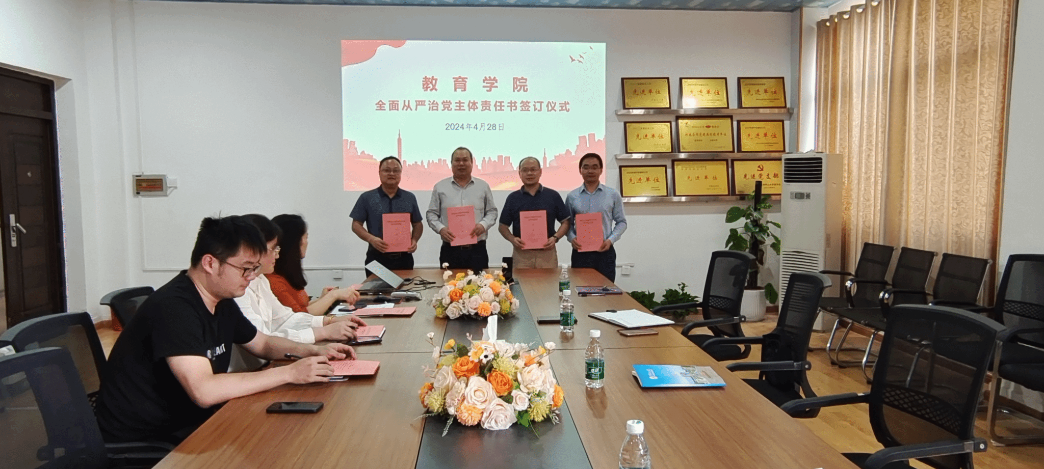 最后,院长胡忠光代表学院党政与班子成员、其他院领导与分管科室和实验室负责人、班主任分别签订了《教育学院2024年全面从严治党工作责任书》、《教育学院2024年平安建设工作责任书》,要求各相关负责人切实落实全面从严治党和平安建设工作目标责任书的各项任务,持续强化底线思维和忧患意识、加大相关工作力度,助力学院高质量跨越式发展。(文:余树英,图:肖媛娥,审核:肖媛娥、周光培、胡忠光)