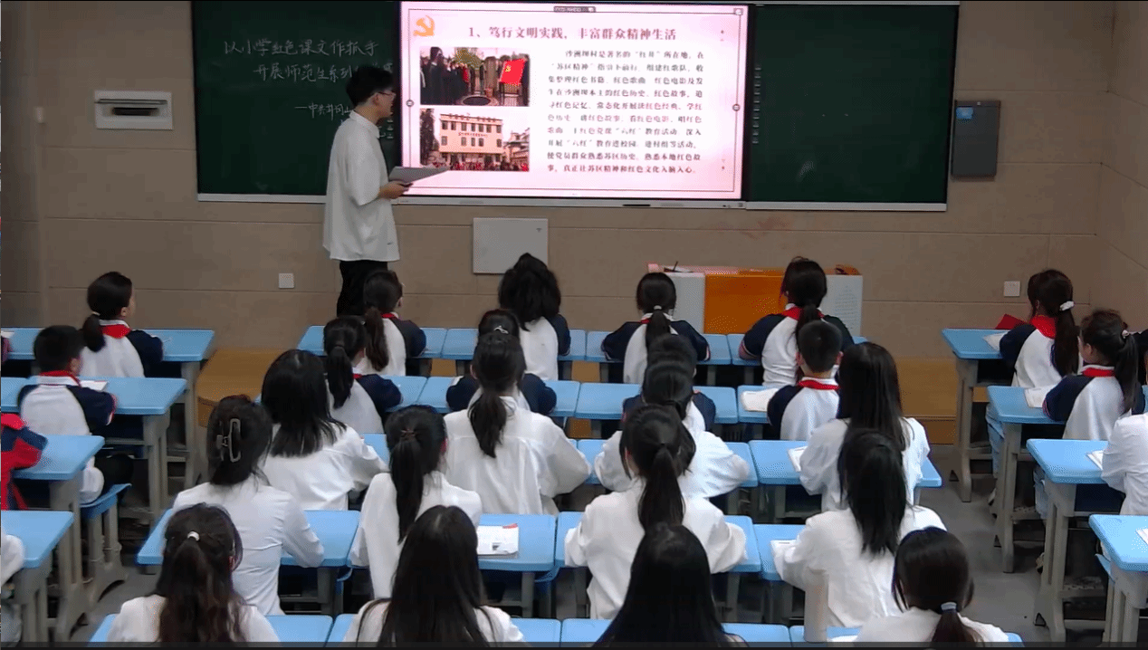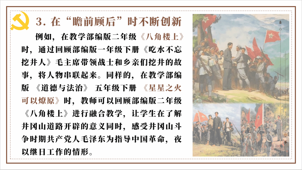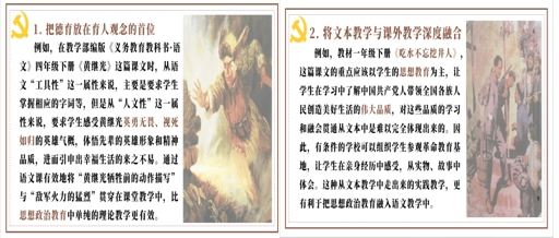 接着,党课分析语文在四年级《黄继光》这篇课文中所体现的“工具性”与“人文性”,强调要把德育放在育人观念首位,把语文学科的丰富德育素材放在重要位置;结合二年级语文《八角楼上》、五年级道德与法治《星星之火可以燎原》两篇课文,强调要在“瞻前顾后”时不断创新,把语文教学与思政教育穿插融合;此外,党课还提出将文本教学与课外教学深度融合,适时、适地地引导学生从课堂中走出来、走进社会中去,相比思想政治教育中单纯的理论教学更有效。
