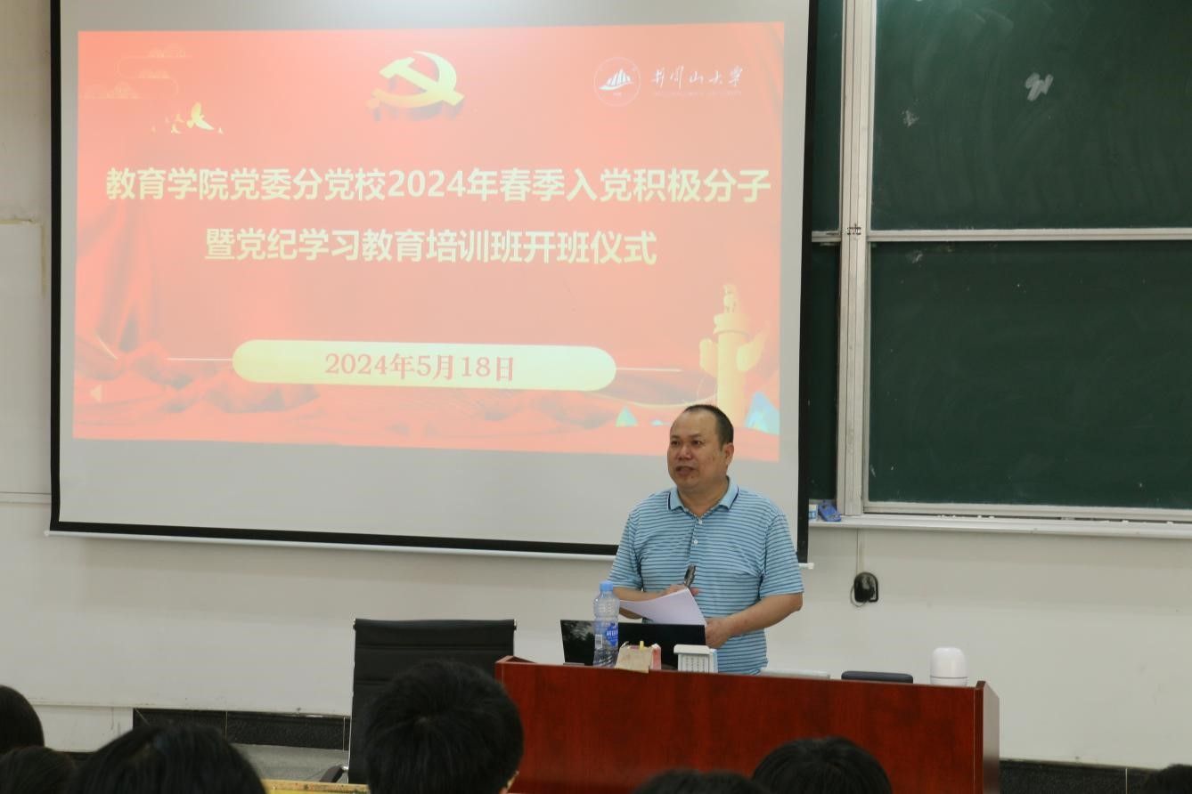 春风拂面,阳光正好,在全国上下深入开展党纪学习教育之际,教育学院党委分党校迎来了2024年春季入党积极分子暨党纪学习教育培训班,开班仪式于5月18日上午9时在第五教学楼205室顺利举行。院长胡忠光、院党委副书记周光培出席,各党支部书记、学生党员、入党发展对象及非毕业班入党积极分子共100余人参加。本次开班仪式由学院专职组织员余树英老师主持。