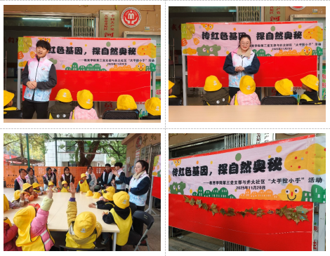 为传承红色基因,播撒科学种子,11月20日下午,教育学院第三党支部与井大社区联合举办了以“传红色基因,探自然奥秘”为主题的“大手拉小手”实践活动。