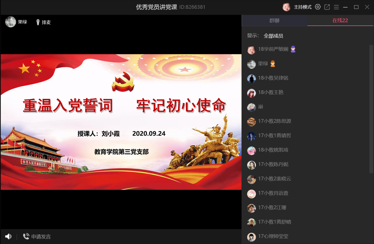 刘小霞以“重温入党誓词、不忘初心使命”为主题,从“让我们的初心亮一亮相”“和我们的初心对一对表”“把我们的初心淬一淬火”三个方面,带领学生党员重温入党誓词,端正入党动机,坚定理想信念;引导学生党员深入思考,进一步认识自己的不足,明确今后的努力方向。
