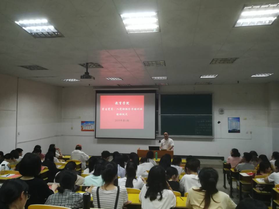 5月20日晚,教育学院党委学生党员、入党积极分子理论学习专题培训班(2019年第1期)结班式在5栋105教室举行。教育学院党委副书记习军明出席结班式并讲话。非毕业班学生党员、入党积极分子共计103人参加结班式。