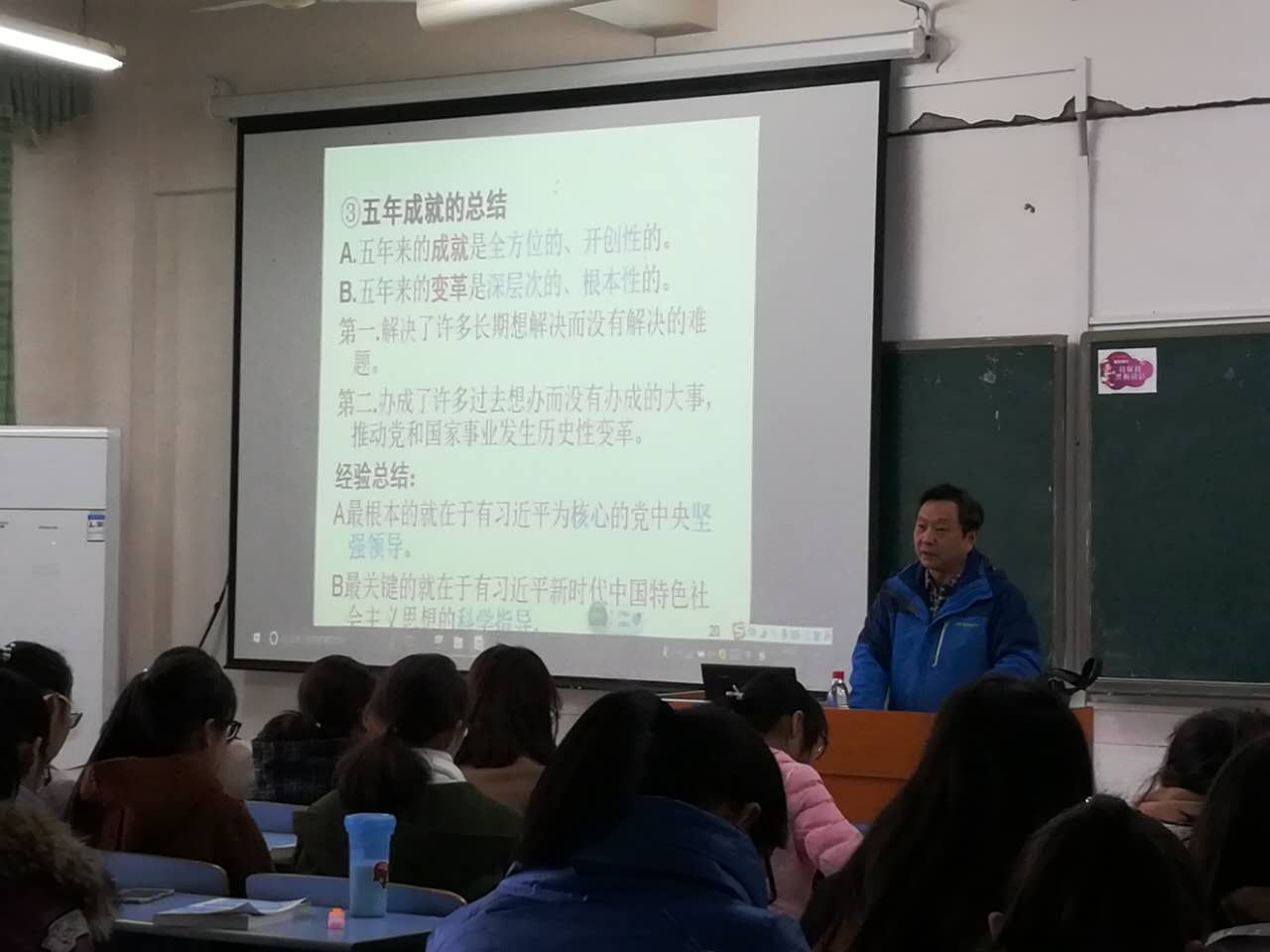 11月20日下午,校党委常委、纪委书记史胜平来我院为2017级小学教育专业100余学生以“高举伟大旗帜,实现伟大梦想——党的十九大精神宣讲”为题上思想政治教育课。