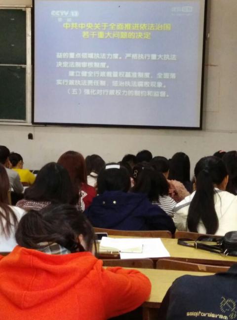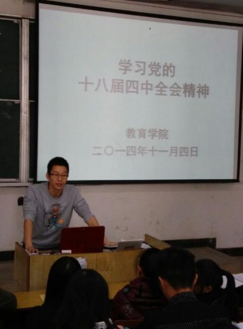 为深入学习党的十八届四中全会精神,教育学院于11月4日中午在5栋104开展集中学习党的十八届四中全会精神活动。学习活动由团委学生科康敏昌老师主持。学院各党支部学生党员和入党积极分子,全体团学干部110余人参加了学习活动。