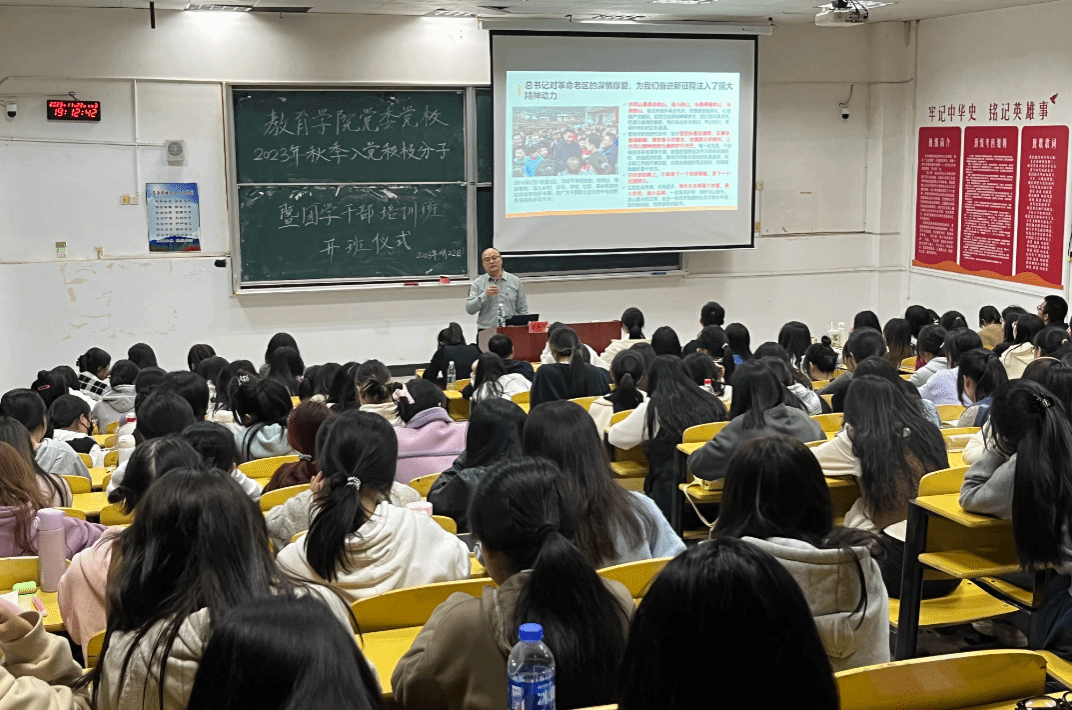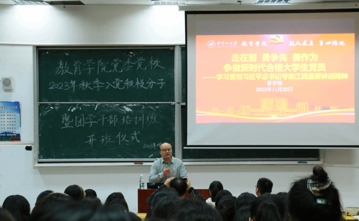 11月22日晚,教育学院党委举行习近平总书记考察江西重要讲话精神宣讲会暨学院2023年秋季入党积极分子培训班专题党课,院党委书记曾学锋作宣讲报告,院党委副书记周光培主持,各党支部书记、全体学生党员、非毕业班入党积极分子、学生代表共140余人参加。