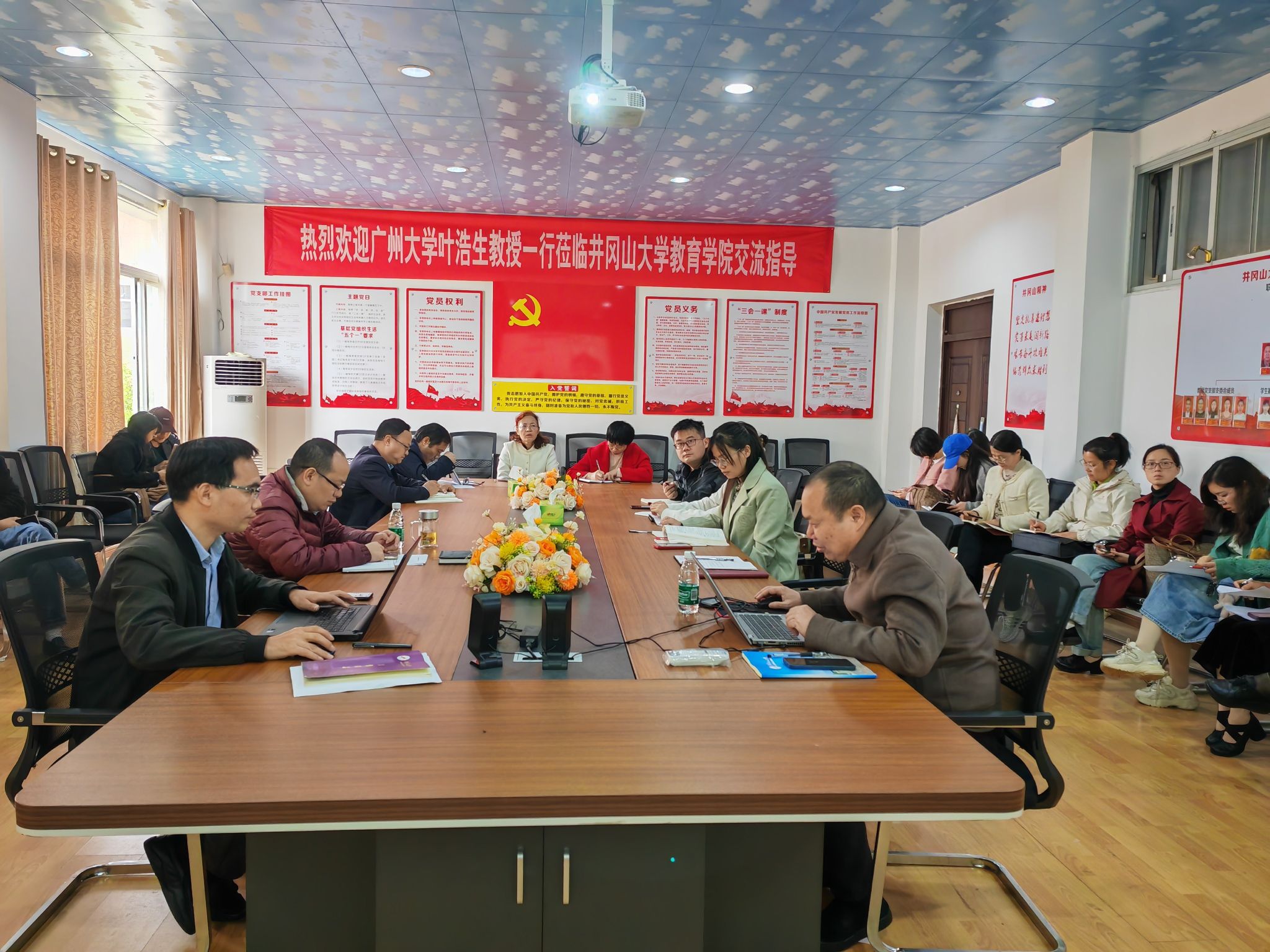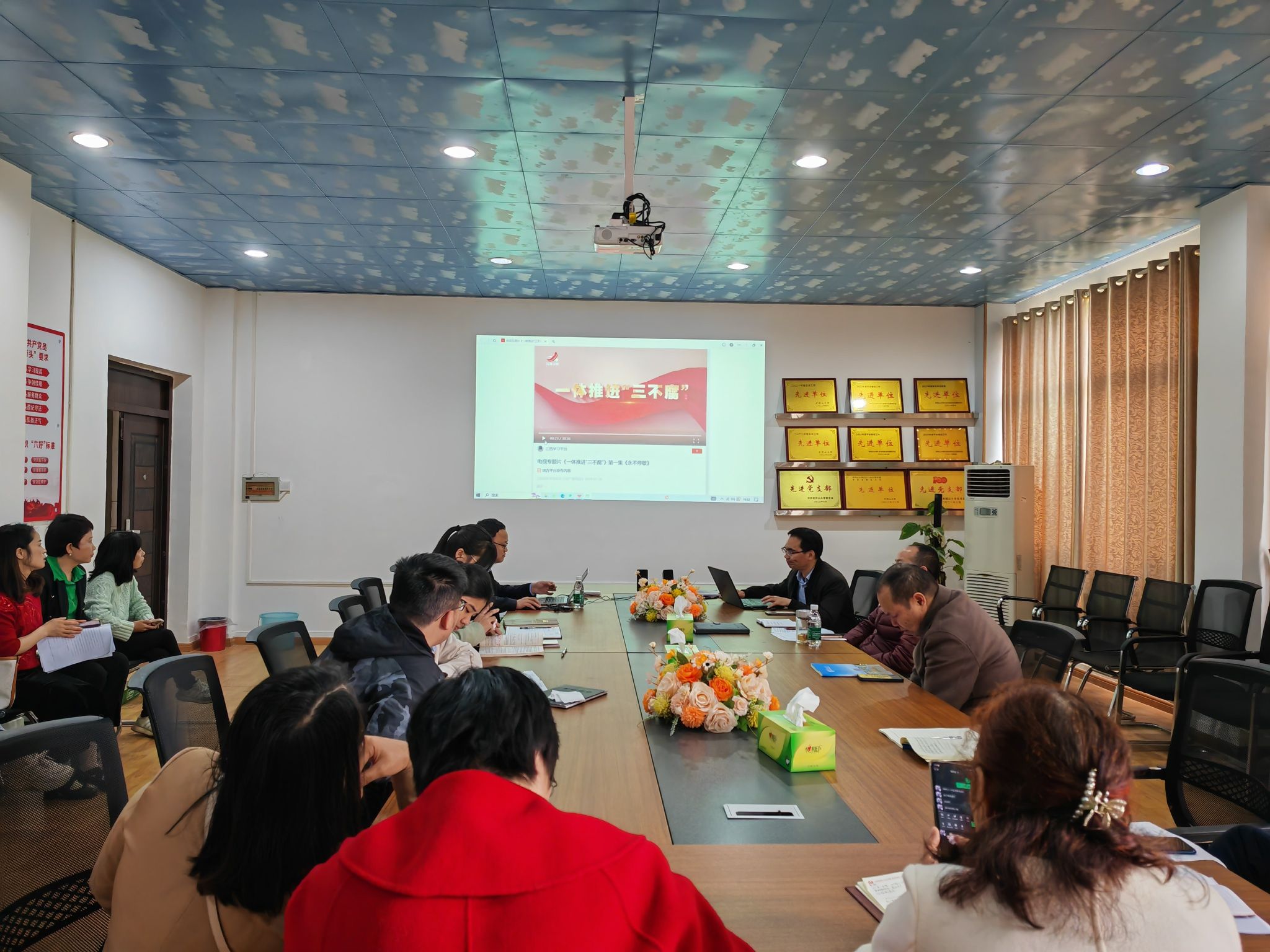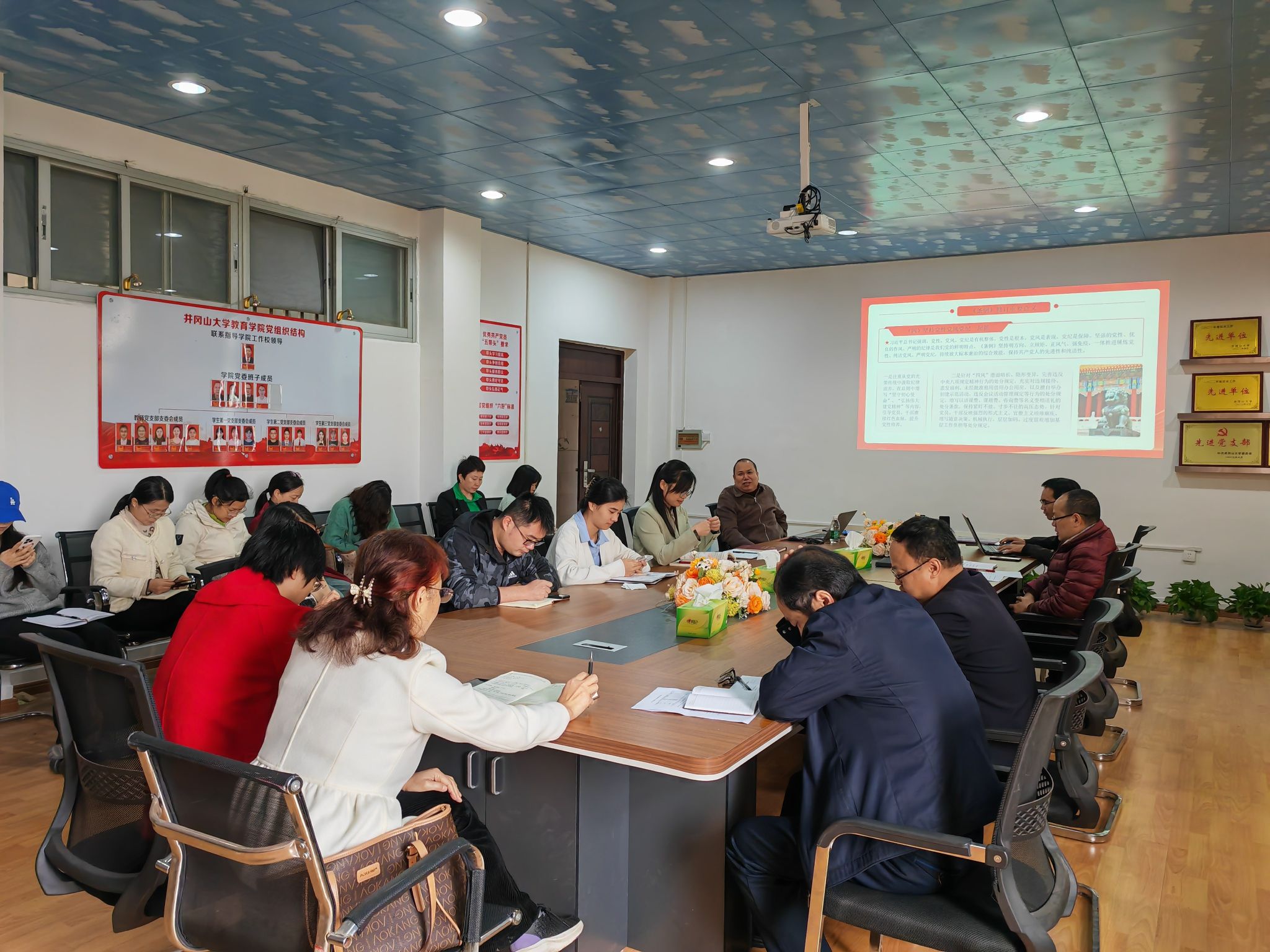 党课结束后,学院开展党员干部警示教育,全体教师党员集中观看《一体推进“三不腐”》警示教育片。接着,院党委副书记周光培传达学习吉安通报6起典型“四风”问题等。