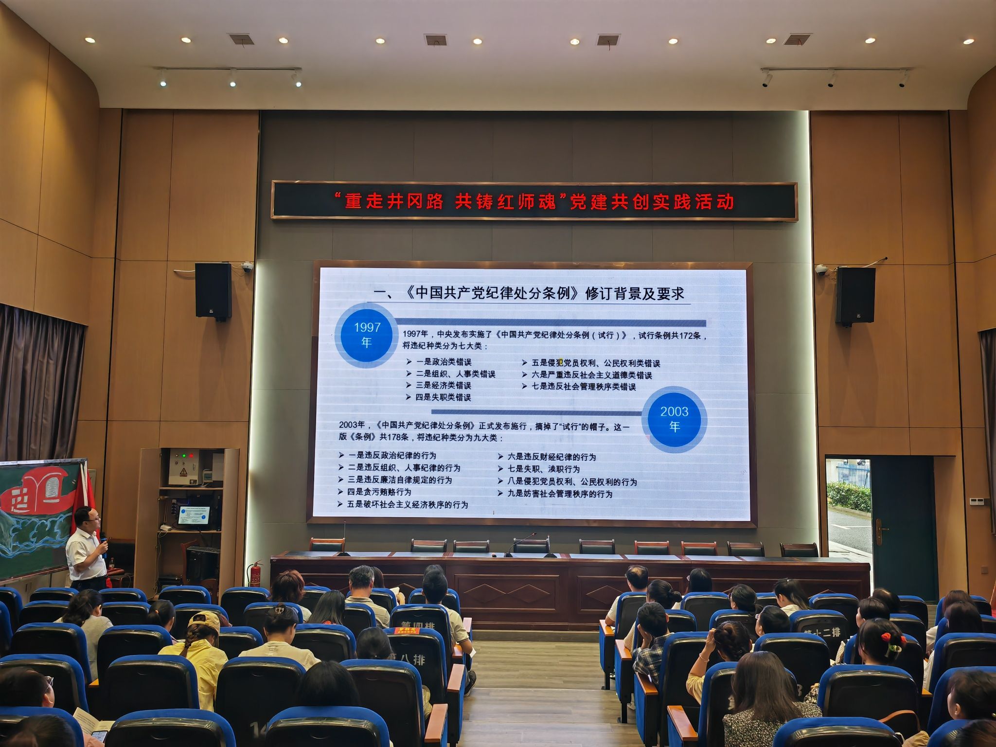 4月29日上午,教育学院应邀在青原区思源实验学校同上党纪学习教育专题党课,共同学习新修订的《中国共产党纪律处分条例》。教育学院党委副书记周光培主讲,青原区思源实验学校党总支书记秦年丰主持,青原区思源实验学校及其结对帮扶单位东固民族中小学教师党员、教育学院第二党支部教师党员及在青原区思源学校实习的学生党员、入党发展对象、入党积极分子参加。