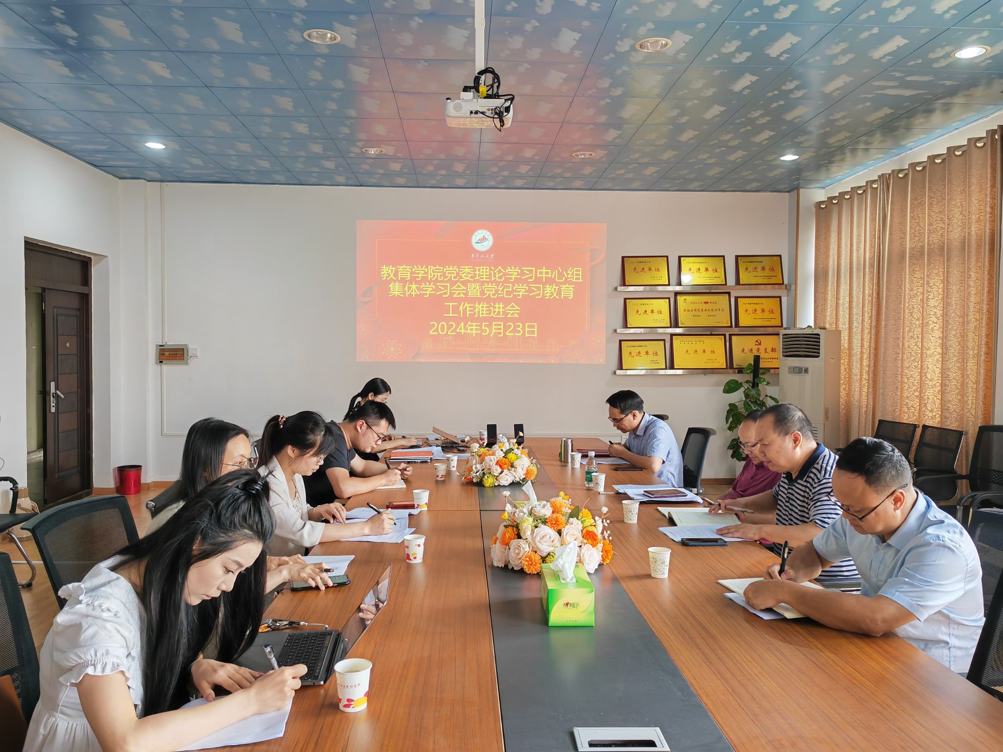 5月23日下午,教育学院召开党委理论学习中心组2024年第7次集体学习会暨党纪学习教育工作推进会。院党委班子成员、各科室党员负责人、各党支部书记、专职组织员参加,院长胡忠光主持。