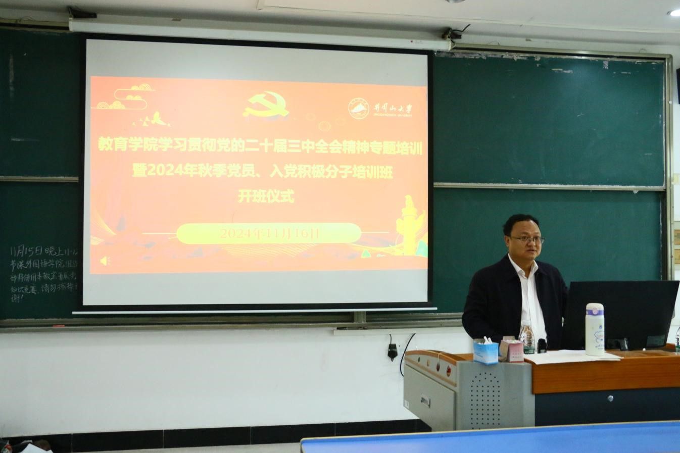 为引领广大青年学生永远跟党走、奋进新征程,引导入党积极分子学习党史,了解党情,认识入党初心,端正入党动机,11月16日上午,教育学院学习贯彻党的二十届三中全会精神专题培训暨2024年秋季党员、入党积极分子培训班顺利开班。院长胡忠光出席开班仪式并作动员讲话。学院党委副书记周光培出席,党员、入党发展对象、非毕业班入党积极分子共100余人参加。