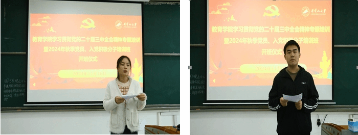 接着,学员代表彭高丽和李志康同学发言。他们表示,作为学生党员和入党积极分子,深刻理解了党员为人民服务的真谛,明白了入党是为践行心中那份对人民的爱。他们将以身作则,以饱满的热情、积极的态度投入到培训中,确保培训取得实效,始终把理想信念放在首位,真正做到怀抱梦想又脚踏实地,既敢想敢为又善作善成。