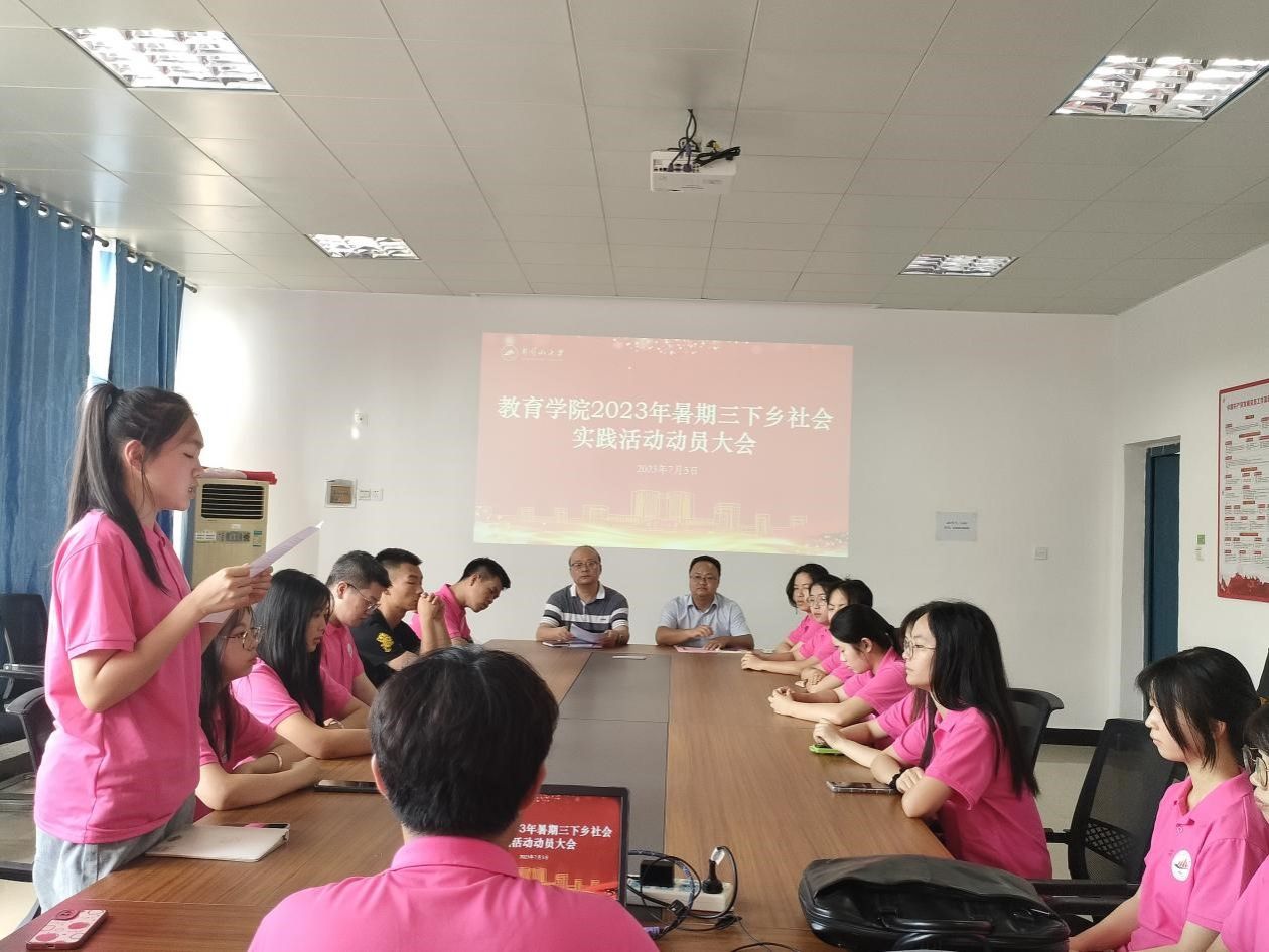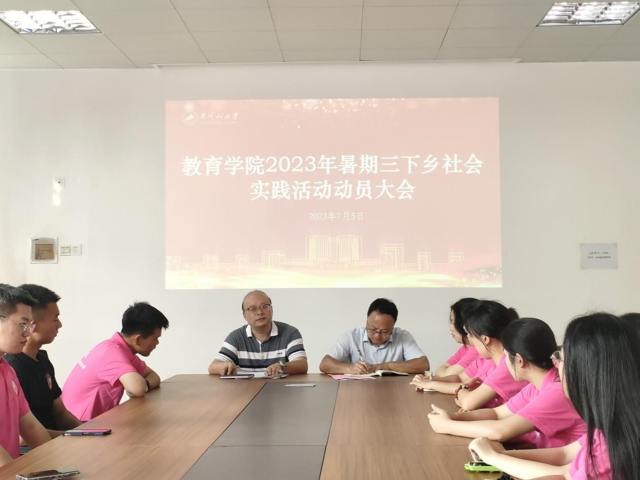 为深入学习宣传贯彻习近平新时代中国特色社会主义思想,全面贯彻落实党的二十大精神,引导和帮助广大青年学生在暑期社会实践的“大思政课”中“受教育、长才干、作贡献”,教育学院于7月5日举行2023年暑期“三下乡”社会实践活动出征动员大会,学院党委书记曾学锋出席并讲话,全体队员参加,副书记周光培主持。
