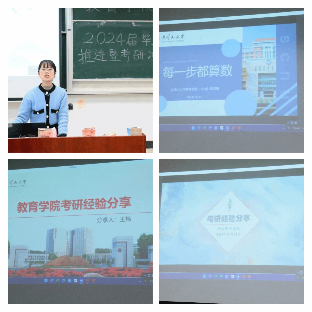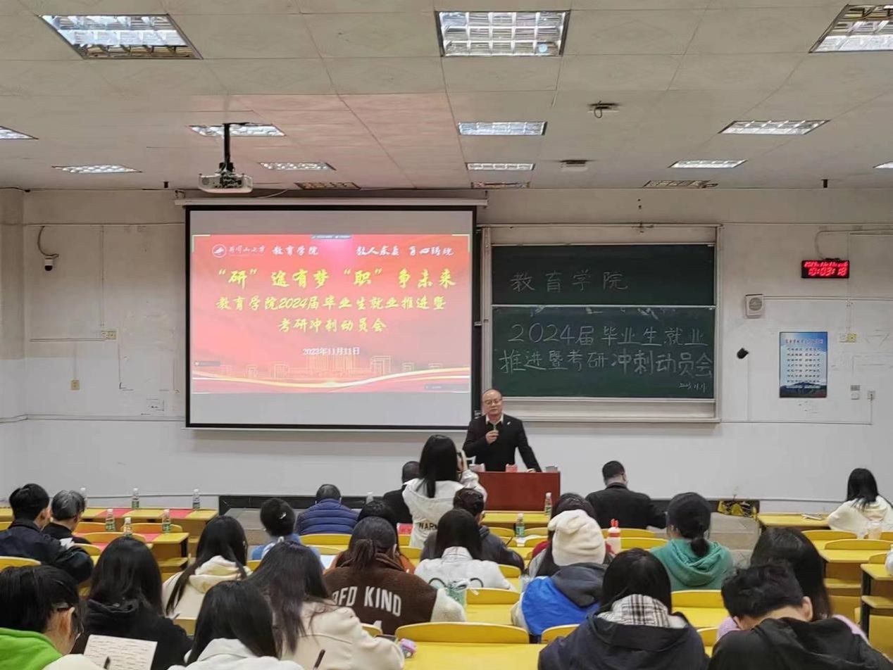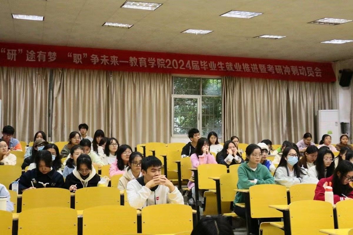 为促进我院2024届毕业生更加充分更高质量就业,切实发挥好朋辈引领促成长的作用,不断提升学生考研积极性和备考策略,11月11日上午,教育学院在第五教学楼105室举行2024届毕业生就业推进暨考研冲刺动员会,院党委书记曾学锋、院长胡忠光、副书记周光培、副院长梁尔铭和各专业负责人、辅导员、毕业班班主任出席活动,邀请了倪星灿、陈泽妍、郑岚婷、王炜等4位2023届考研成功上岸毕业生和2024届考编就业代表罗晓燕作经验分享,有志于考研的2024届毕业班学生和其他学生代表90余人参加。