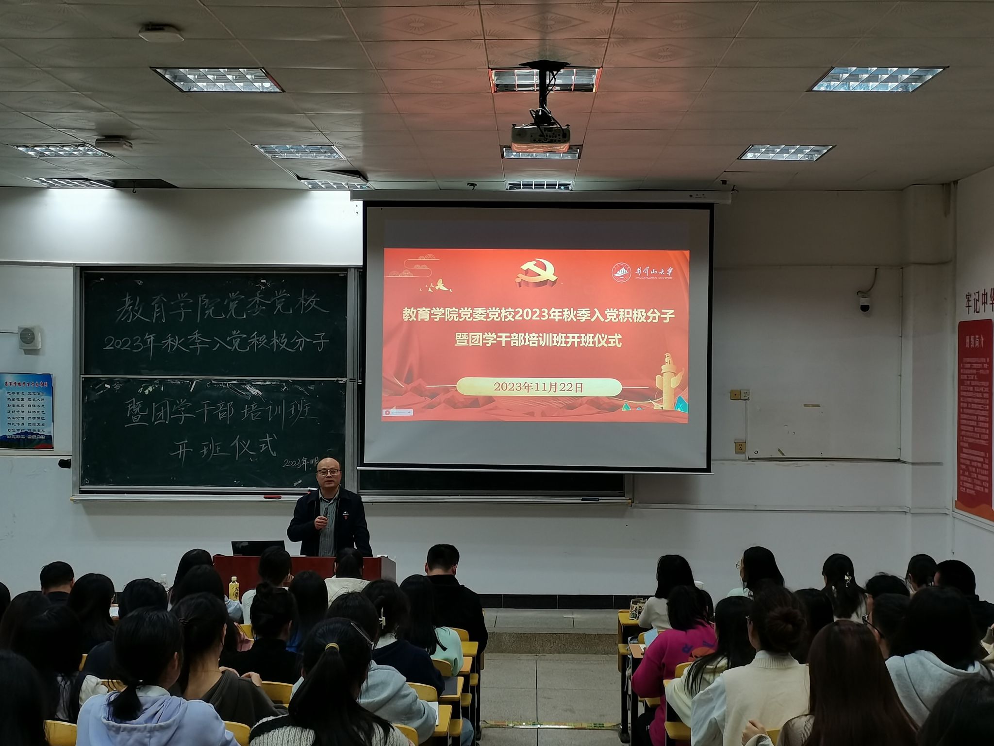 11月22日晚,教育学院党委党校2023年秋季入党积极分子暨团学干部培训班在第五教学楼407顺利开班。院党委书记曾学锋出席开班式并作动员讲话,院党委副书记周光培主持,专职组织员余树英、团委负责人袁玮键和各学生党支部书记、支委、全体学生党员、非毕业班入党积极分子、团委学生会骨干代表共140余人参加。