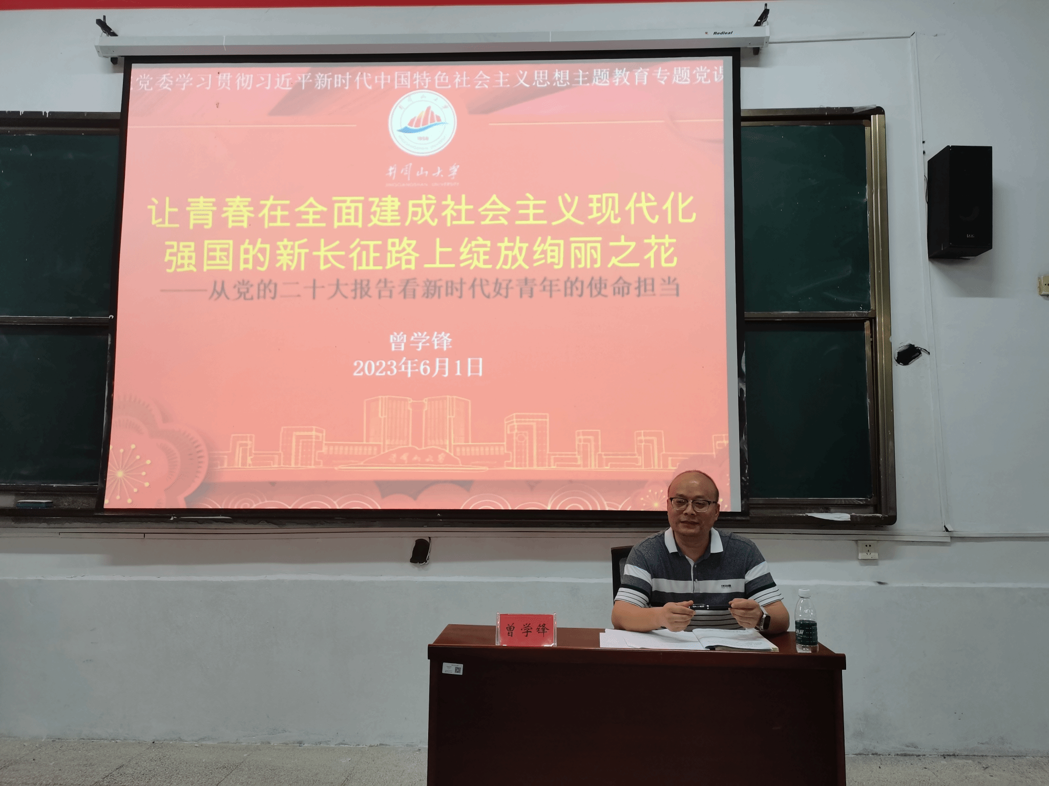 为全面贯彻落实党的二十大精神,深入推进学习贯彻习近平新时代中国特色社会主义思想主题教育走深走实走心,6月1日下午,教育学院党委书记曾学锋为学院大学生作了题为《让青春在全面建成社会主义现代化强国的新长征路上绽放绚丽之花——从党的二十大报告看新时代好青年的使命担当》主题教育专题党课,学院辅导员和学生代表共100余人参加,党委副书记周光培主持。