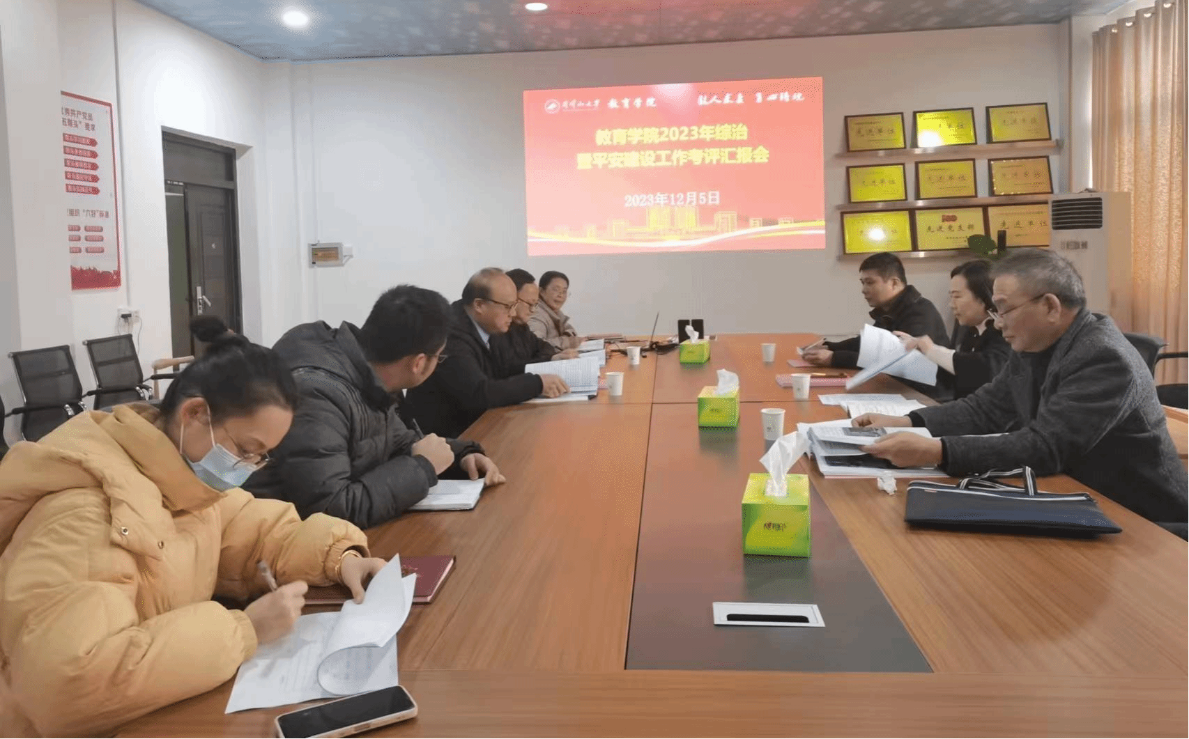 12月5日上午,教育学院召开2023年综治工作暨平安建设考评汇报会,学校综治工作考评组组长、离退休人员工作管理处处长杨芳一行3人来院现场指导考评,学院党委书记曾学锋作情况汇报,副书记周光培和学院办公室、团委、学生科等相关负责人参加会议。