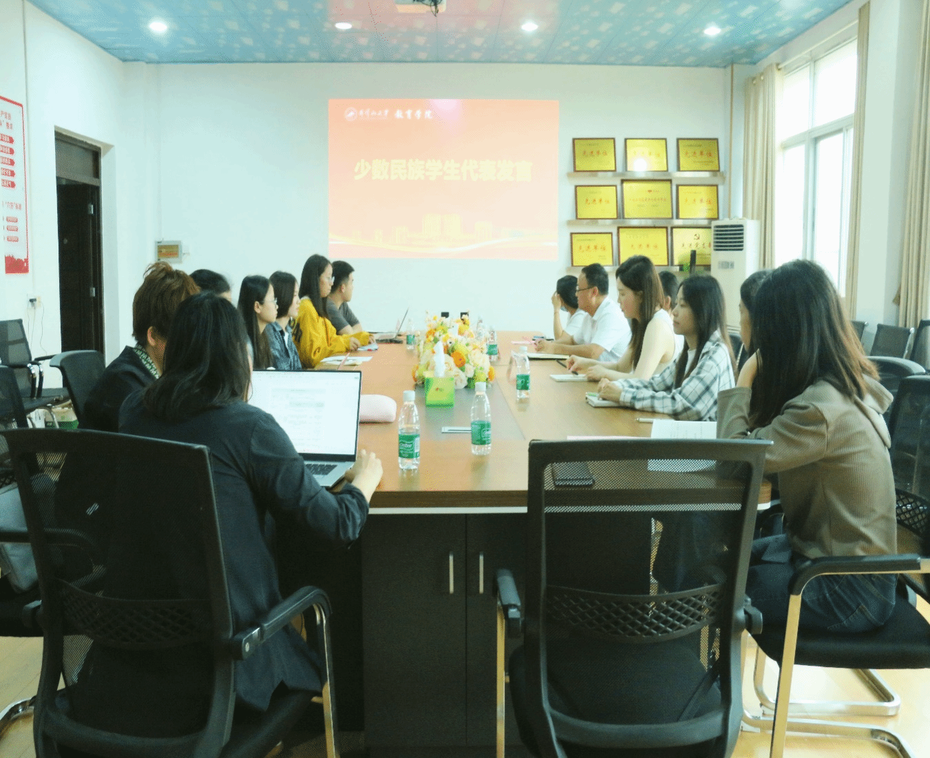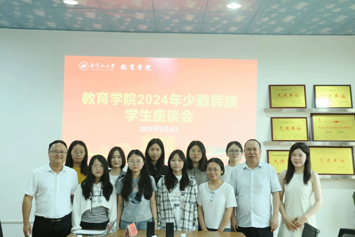为倾听少数民族学子心声,共促民族团结,5月9日下午,教育学院在3栋303会议室召开少数民族学生座谈会,学院院长胡忠光出席座谈会,在校的9 名少数民族学生代表参加座谈会,座谈会由学院党委副书记周光培主持。