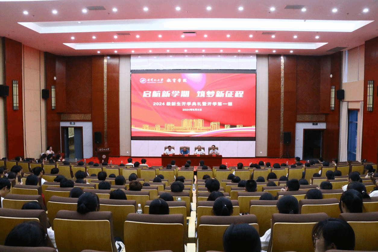 启航新学期,筑梦新征程。9月6日晚,教育学院2024级新生开学典礼暨“开学第一课”在新图书馆一楼报告厅隆重举行。院长胡忠光向全体新生作开学第一课,副院长梁尔铭致辞,副院长于文军,2024级新生班主任、全体辅导员,各科室、专业负责人、教研室主任,2024级全体新生以及部分2022级专升本学生参加典礼。典礼由院党委副书记周光培主持。