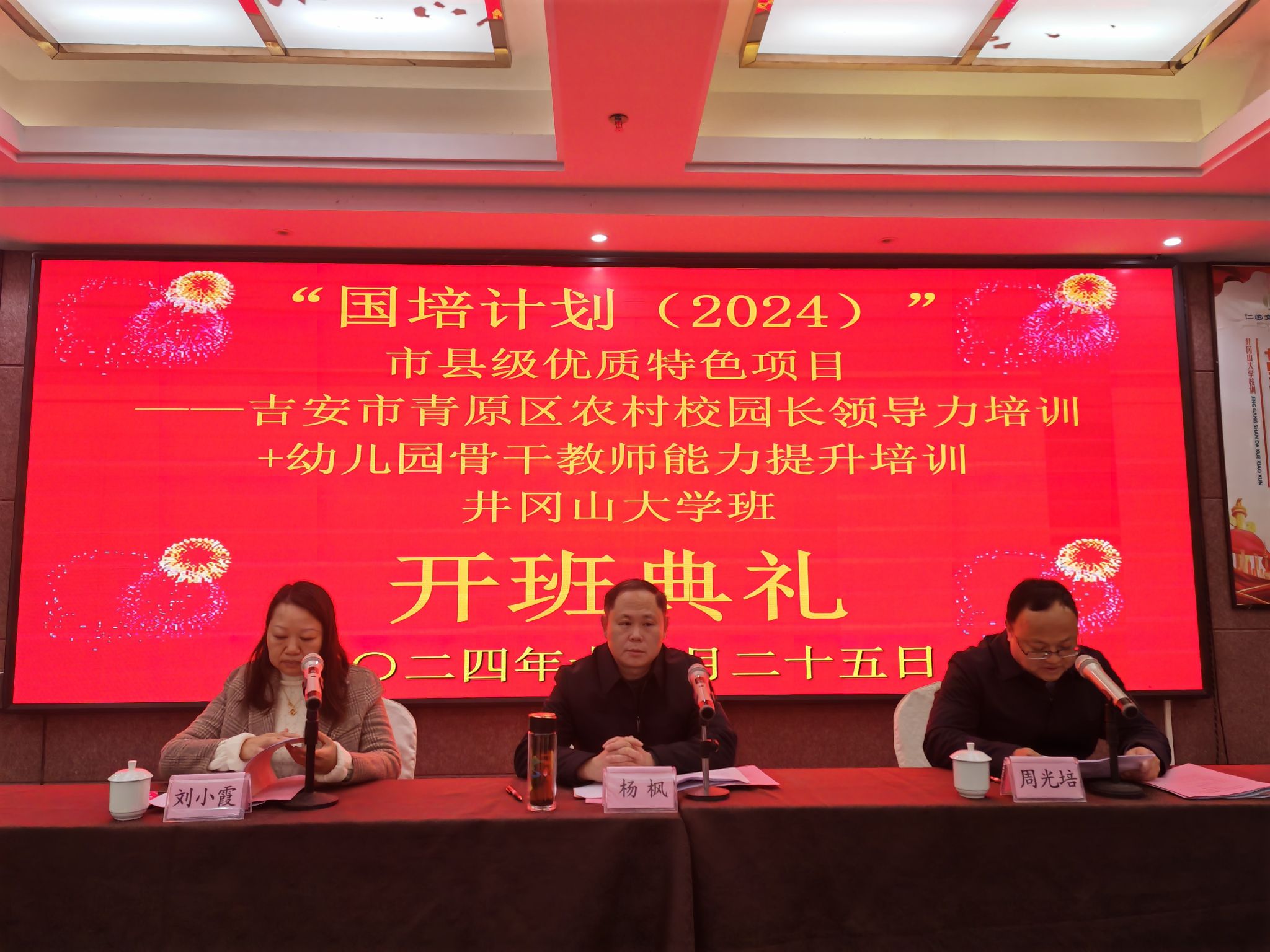 2024年12月25日上午,由井冈山大学教育学院承办的“国培计划(2024)”市县级优质特色项目——吉安市青原区农村校园长领导力培训和农村幼儿园骨干教师能力提升项目,在仁达文化酒店顺利开班。青原区委教体工委委员、教体局副局长杨枫,井冈山大学教育学院党委副书记周光培出席,来自青原区的60名中小学(幼儿园)书记、校长,以及乡镇60名幼儿园骨干教师参加了开班式。