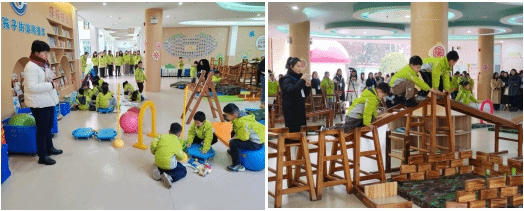 在户外自主游戏课例展示环节,吉安市保育院教师周颖、戈思敏以低结构材料为媒介,引导幼儿在开放环境中自由探索、合作创新。王彬教授与吴环欣老师全程参与观摩,重点关注幼儿与材料的互动、学习品质的培养及教师观察指导策略。孩子们天马行空的创造力和教师“观察者”“支持者”的角色实践,生动诠释了“以游戏点亮童年”的教育理念。