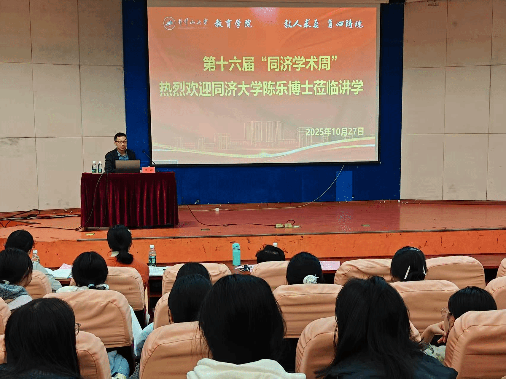 为助力同济大学对口支援井冈山大学二十周年暨第十六届“同济学术周”活动,持续强化学院学科专业建设,厚植学术科研沃土,为人才培养与师生发展赋能增效,10月27日上午,我院邀请同济大学高等教育研究所助理教授陈乐博士在10栋数理大楼学术报告厅举行了学术报告会。学院副院长梁尔铭主持报告会,院长胡忠光和学院师生代表100余人参加了报告会。