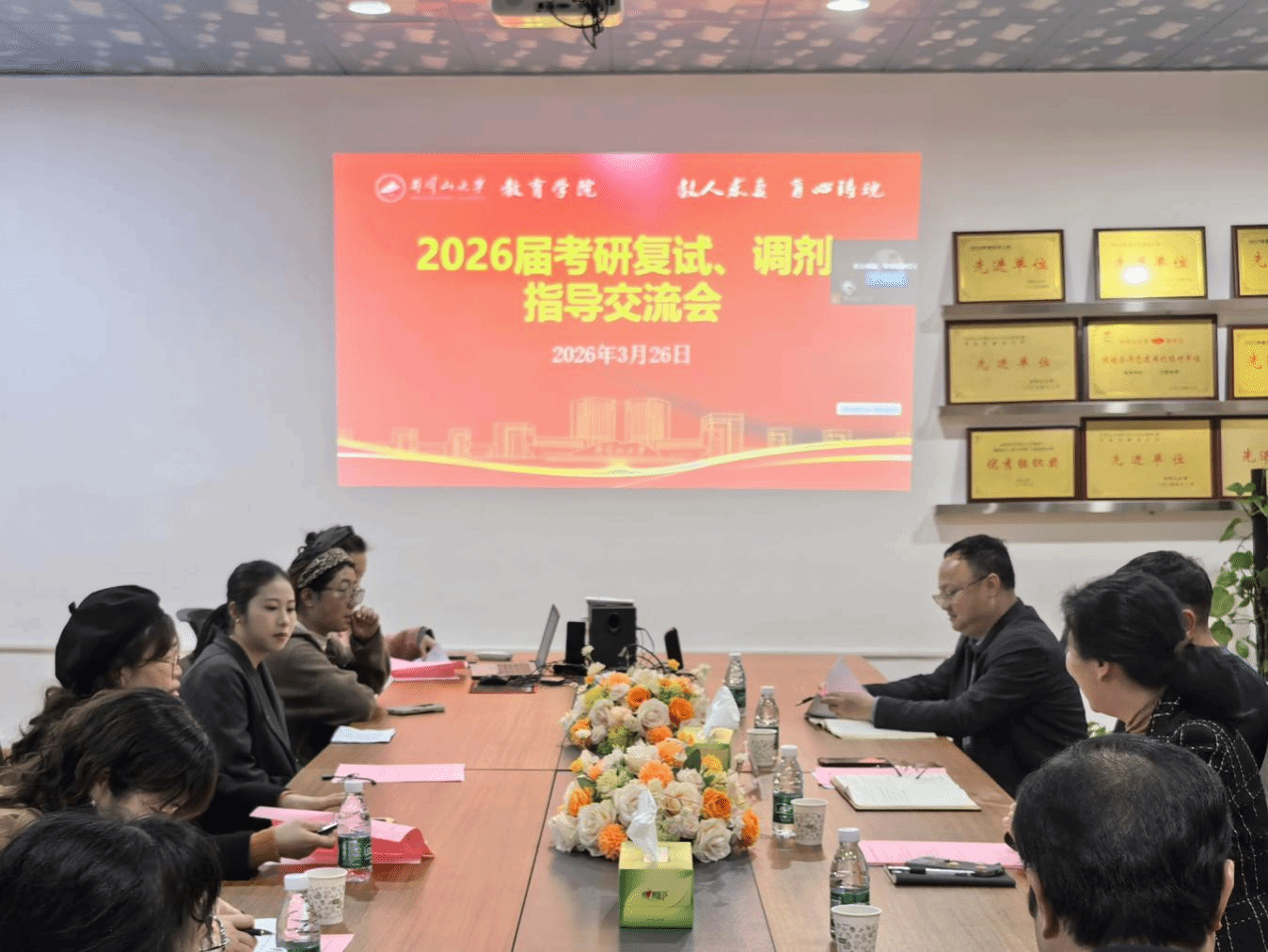 彭青详细介绍了学院目前的考研工作进展。专业负责人结合专业,详细梳理了院校信息搜集渠道、调剂流程及注意事项。