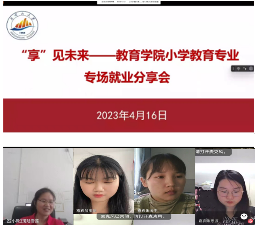 为更好推动2023届毕业生就业工作,教育学院于4月16日下午举行小学教育专业优秀校友线上就业分享会,邀请了近年毕业的朱凌宇、丁璇、陈思源、郭慧娟、邹雨洁等5位优秀毕业院友进行经验分享和答疑解惑,共计200多名同学线上参会,分享会由学院就业干事余树英老师主持。