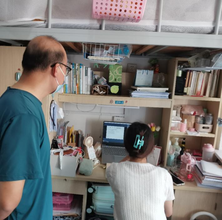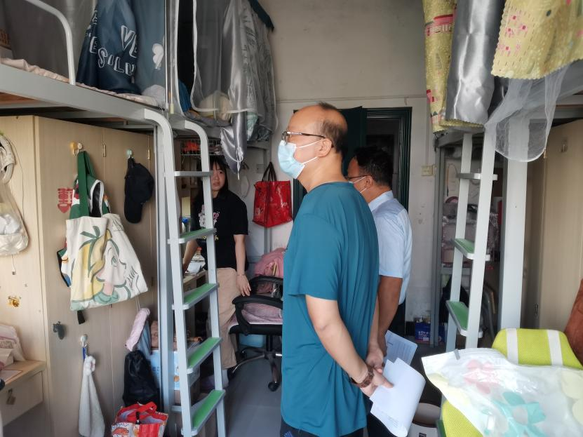 为全面落实学校疫情防控会议精神,了解学生线上教学、宿舍管理、思想动态等情况,9月6日上午8点,在学校实现校门封控应急管理线上教学第一天,学院党委书记曾学锋、副书记周光培,学生科胡婷老师深入学生宿舍25栋、29栋学生宿舍检查线上教学和疫情防控工作。