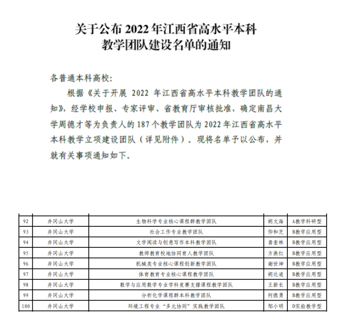 近日,江西省教育厅发布了《关于公布2022年江西省高水平本科教学团队建设名单的通知》,公布了2022年江西省高水平本科教学立项建设团队的名单,我院由方燕红教授负责的教师教育校地协同育人教学团队(B教学应用型)获批立项。