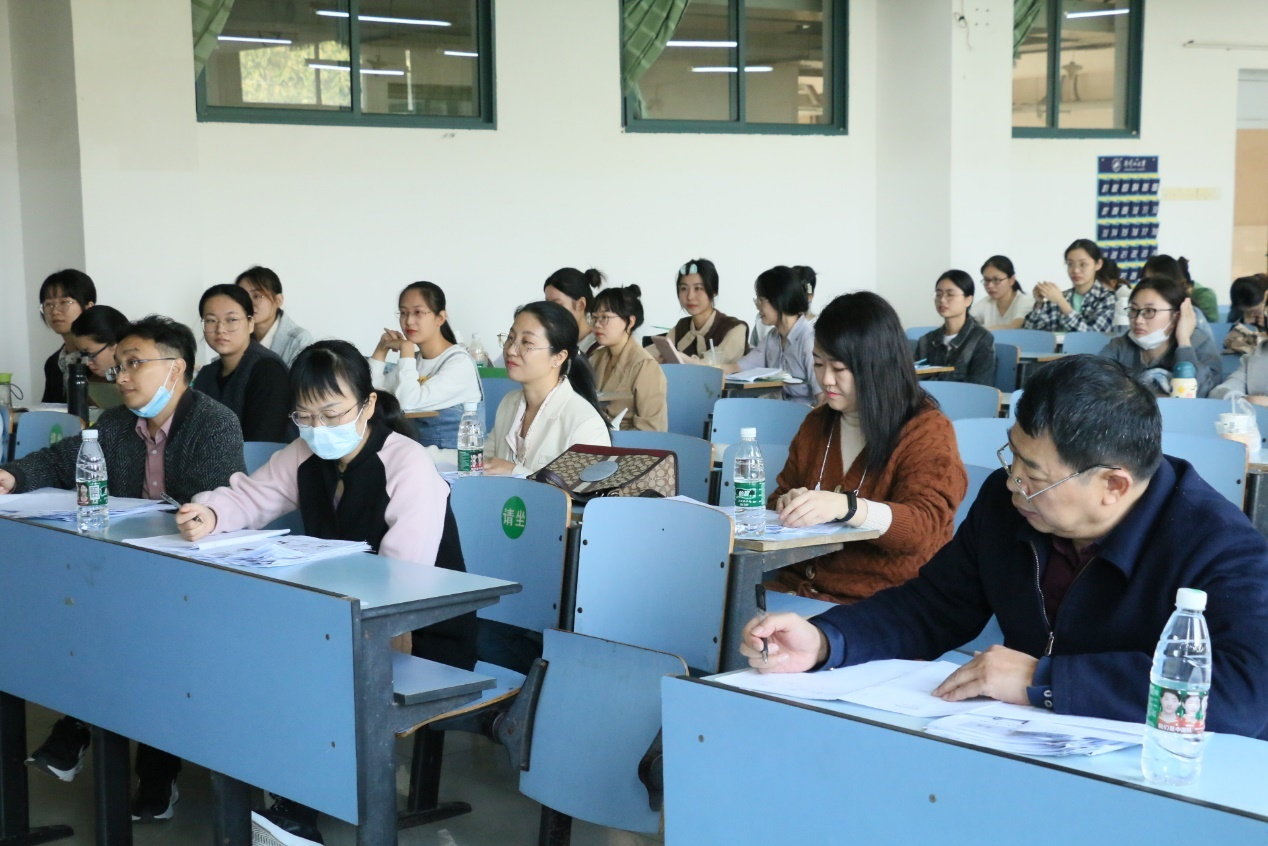 比赛内容包括“设计”和“试讲”两个部分,既考察了选手们的教学设计、内容规划以及排版,也锻炼了她们的教姿教态、板书设计和无生试讲技能等方面。参赛选手们的表现都十分出色,PPT设计新颖生动,贴纸童趣可爱,其中陈泽妍同学用全英文试讲、郭瑜虹等同学的试讲中有配乐朗诵。点评环节中,金学军对选手们的表现给予了肯定,强调授课要达到四点要求:1.外形:语音准确、着装得体、板书规范等 2.内容:说学生听得懂的话、达到表演的境界 3.态度:教案详细、搭配动作等 4.效果:把学生教会、注意课前复习和课后作业;贺明华具体指出了选手们授课过程中存在的不足并提出宝贵的意见。