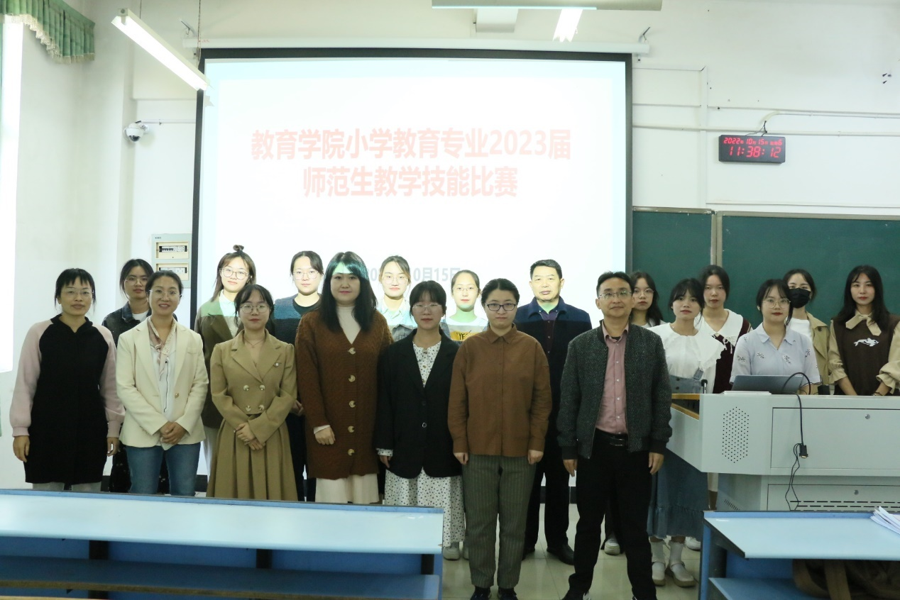为夯实我院师范生教学基本功,强化其教育实践,2022年10月15日上午,教育学院19小学教育专业在10栋数理大楼A101举办2023届毕业生师范教学技能比赛。本次教学技能大赛共有32名同学参加,参赛内容为小学语文、数学、英语三门主科教材,金学军、文梅、金仙珠、贺明华、王丽五位老师担任评委。