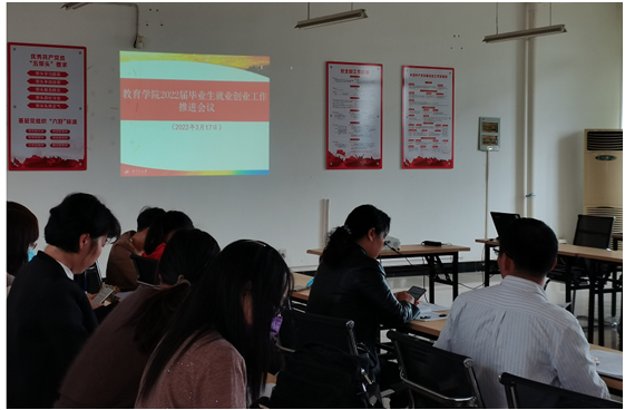 为深入贯彻落实学校关于做好2022届毕业生就业创业工作有关文件会议精神,全员推进学院2022届毕业生就业创业工作,3月17日下午4:00,学院在10栋C505学院党员活动室召开2022届毕业生就业创业工作推进会,院党委书记曾学锋出席并讲话,院长胡忠光主持,其他院领导、各毕业班班主任、各教研室主任、2022届毕业生本科生导师共计30余人参加。