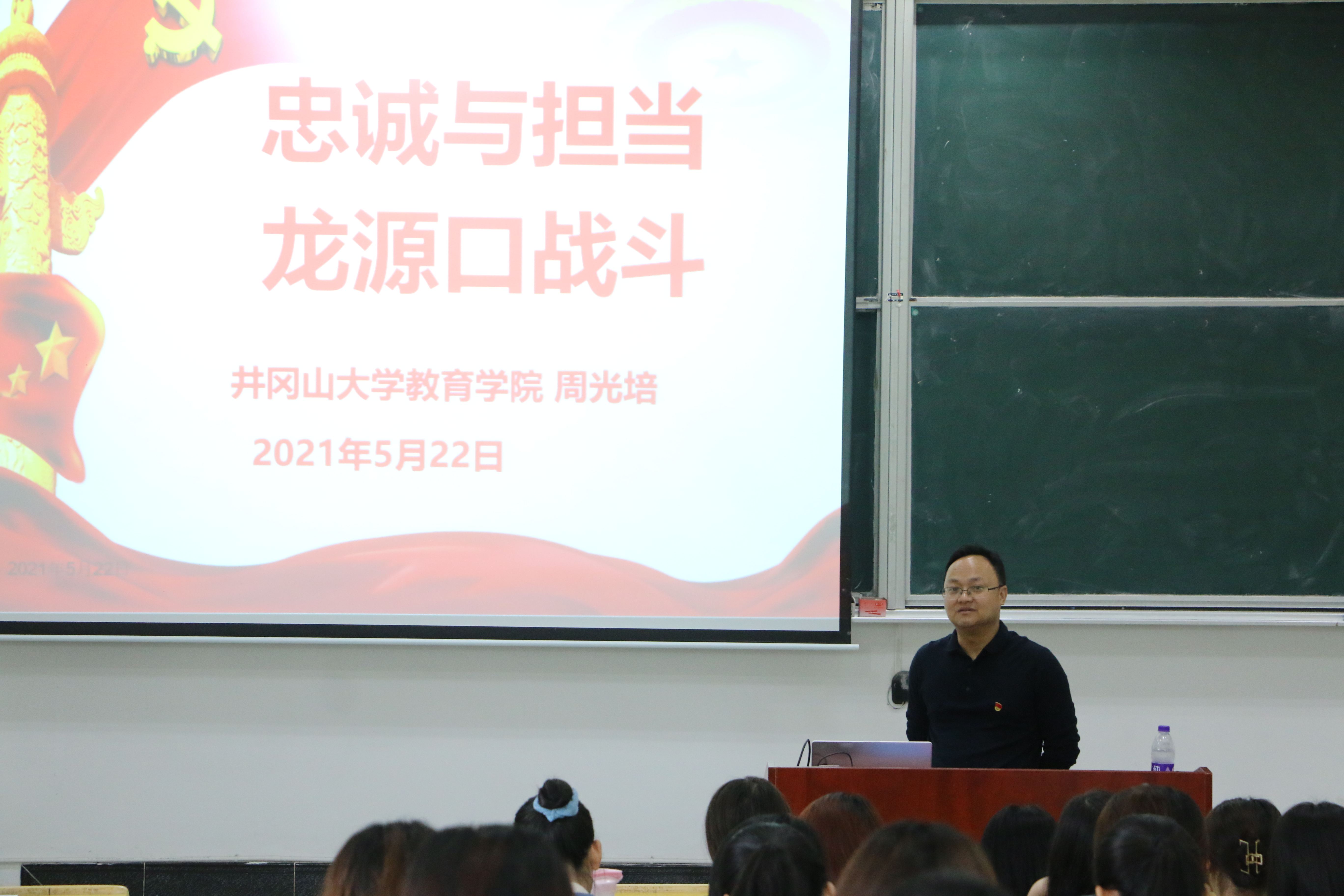 为强化学生党性修养,提高政治觉悟,5月22日上午,教育学院党委副书记周光培以 “忠诚与担当——龙源口战斗”为题,为学院2021年第1期师生党员集中培训暨党史学习教育专题培训班作专题党课。学院部分师生党员、入党发展对象、非毕业班入党积极分子、大骨班学员共100余人参加。