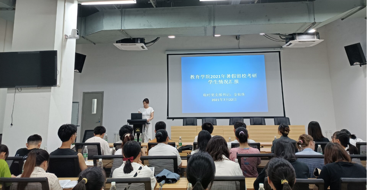 会上,金仙珠博士首先代表留校学生临时党支部对学院留校考研学生情况作了翔实的汇报。在汇报中她通过问卷调查的方式,围绕留校学生暑期计划制定、计划实施情况、自我管理、暑期生活条件的满意度等关心关注的问题,以翔实的数据、亲身的体会、个人的经历,对留校考研学生的学习、生活等方面情况进行了全景展示,并就学生考研中学习生活等方面存在的困惑问题,分享了自己的好经验。
