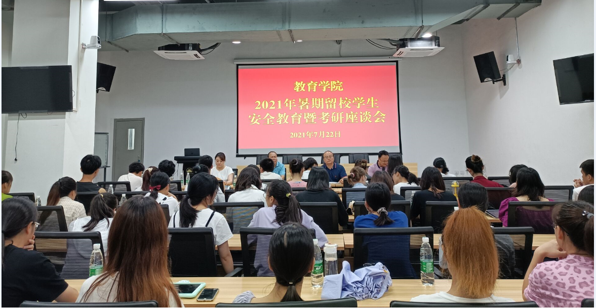 为切实做好学院暑期留校学生的安全教育工作,深入了解暑期留校考研学生备战状况与生活情况,进一步激励同学们保持积极乐观心态,2021年7月22日上午教育学院在图书馆多功能厅召开了2021年暑期留校学生安全教育暨考研座谈会。学院党委书记曾学锋、院长胡忠光、留校学生临时党支部书记金仙珠博士及全体留校考研学生50余人参加会议,会议由党委副书记周光培主持。