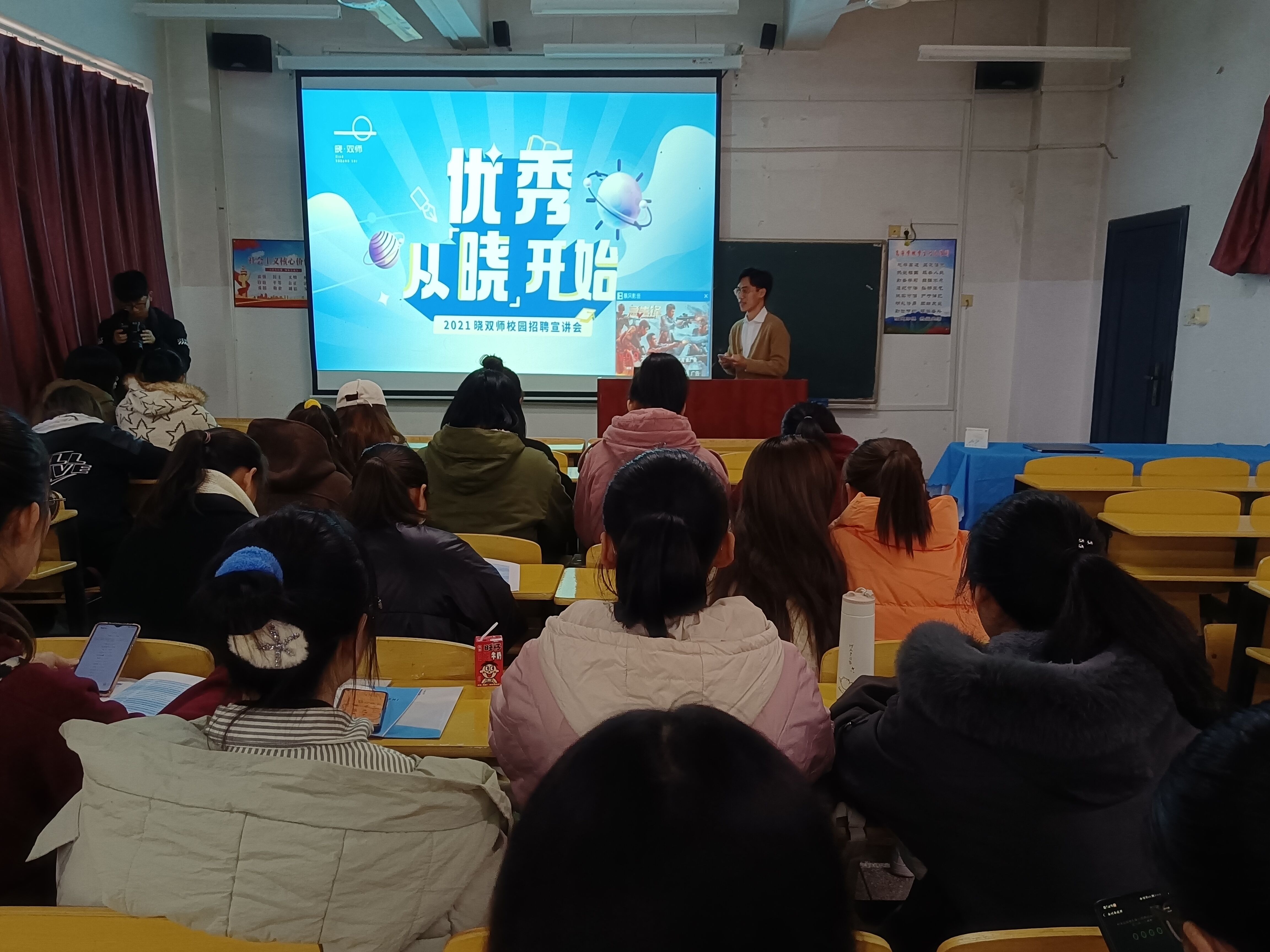 为深入落实教育部2021届全国普通高校毕业生就业创业工作网络视频会议精神和学校党委做好2021届毕业生工作要求,积极拓宽毕业生就业渠道,12月9号下午,教育学院组织毕业班学生在5-201举办“晓·双师”招聘宣讲会。晓双师选聘部陈永轩老师主讲,我院20121届45位毕业生参加招聘宣讲会。