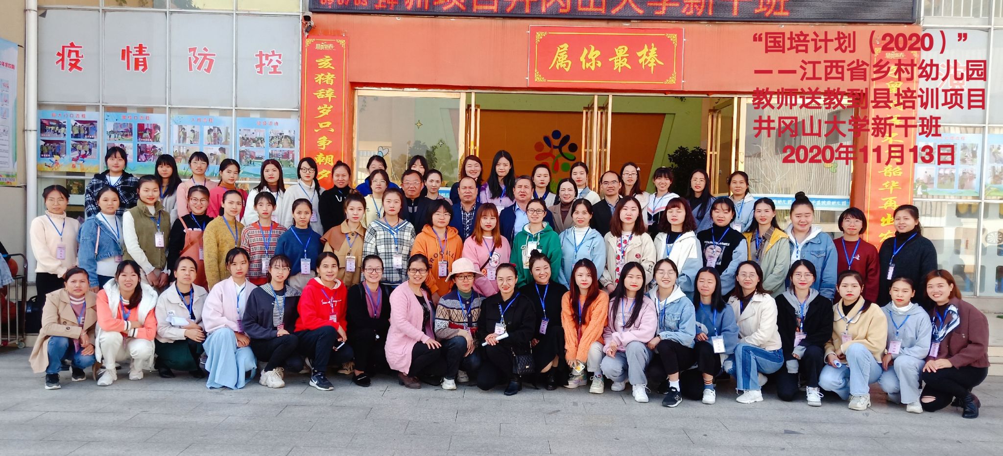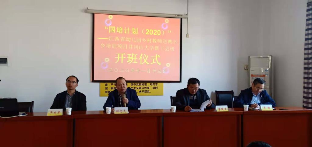 2020年11月13日上午,“国培计划(2020)”——江西省乡村幼儿园教师送教到县培训项目井冈山大学新干班开班仪式在新干城南幼儿园举行。井冈山大学教育学院副院长胡忠光、新干县教体局李国生主任、新干县教师进修学校罗琦副校长出席了开班仪式。参加此次培训的授课教师代表、班主任及65名学员参加了开班仪式。