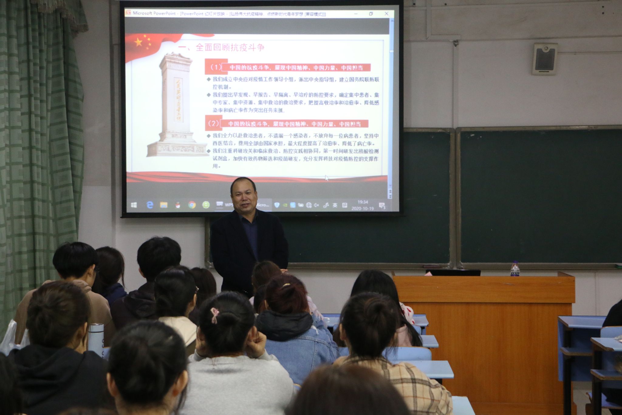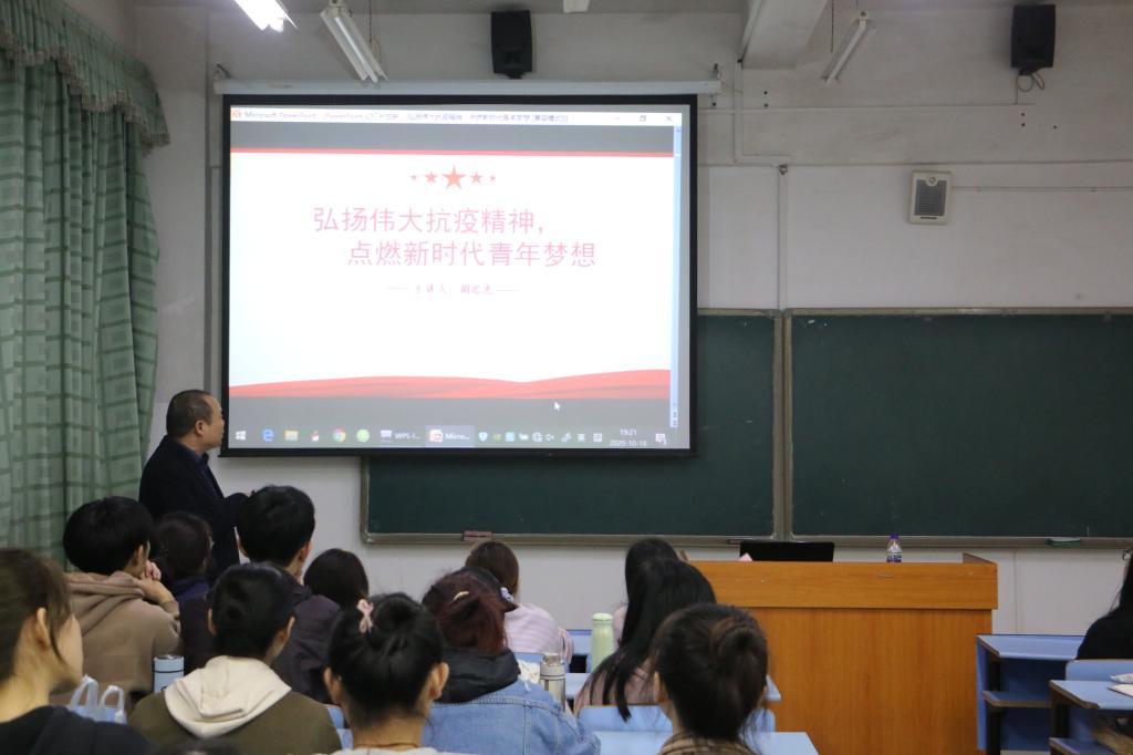 为了弘扬伟大抗疫精神、提高大学生的爱国意识,10月19日,教育学院副院长胡忠光以“弘扬伟大抗疫精神,点燃新时代青年梦想”为主题在18学前2班上思政课。 胡忠光从全国抗击新冠肺炎表彰大会开始引入,先是用数据向大家分析了中国抗击疫情的进程。随后,他带领大家全面回顾抗疫斗争,赞美了英勇挺身再战疫情前线的专业人士钟南山院士、李兰娟院士;放假返程路上得知疫情命令,义无反顾折返工作岗位的医务工作者;正值春节亦是寒冬时节,在户外没日没夜轮班防疫防控的工作人员、志愿者以及井冈山大学7名援鄂医疗队员等等。他指出,正是这无数挺身而出的人物汇聚起来,才成为了不可忽视的强大力量,最终使得国内的疫情控制取得了世界瞩目的成效。接着,他向大家介绍了“生命至上、举国同心、舍生忘死、尊重科学、命运与共”的伟大抗疫精神的内涵。最后,他呼吁大家要像无数抗疫者一样,在心中埋下爱国的种子,让它生根、发芽;同时努力向自己的梦想奋进,争取尽己所能为祖国贡献出自己的力量。