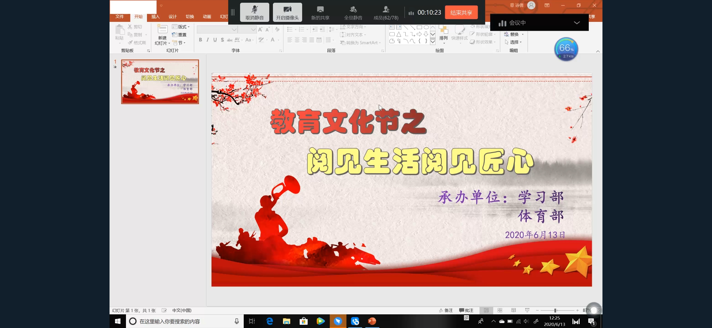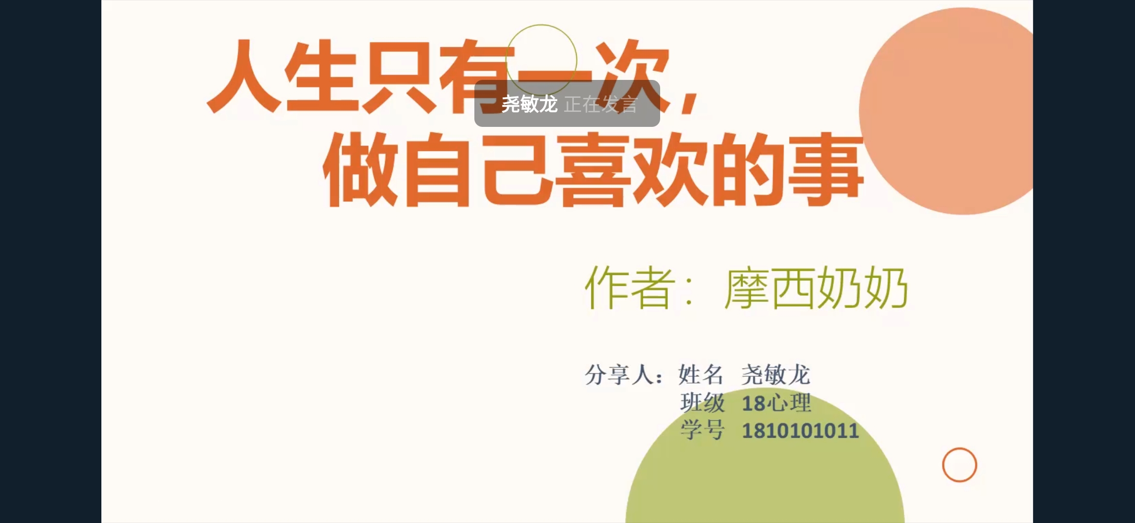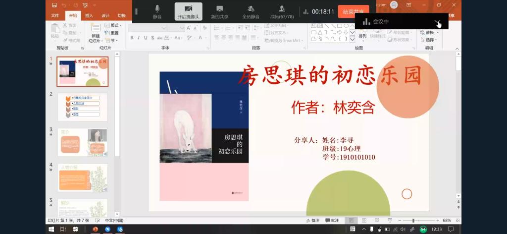 为扩大学生知识面,增强学生人文素养,培养学生对优秀读物的浓厚兴趣。6月13日12:30,教育学院第七届教育文化节之“阅见生活阅见匠心”读书分享活动在钉钉以视频会议的方式举行。本次活动由教育学院学生会学习部和体育部联合举办。 参赛人员须自行寻找书籍资料制作PPT,在比赛过程中按照抽签顺序依次发言,每人发言时间不得超过10分钟。比赛中,19心理李寻、18心理尧敏龙等26位同学依次以播放PPT的方式对《房思琪的初恋乐园》《人生只有一次去做自己喜欢的事》等26本书籍内容进行了介绍,并进行了精句分享等。获胜者由50名观众在钉钉群匿名投票选出,最终,19小教班王笛介绍作品《活着》获得一等奖;19心理班李寻介绍作品《房思琪的初恋乐园》、18小教班吴云婕介绍作品《摆渡人》获得二等奖;19小教班张敏艳介绍作品《平凡的世界》、18小教姚凯琦介绍作品《席慕蓉诗集》获得三等奖。