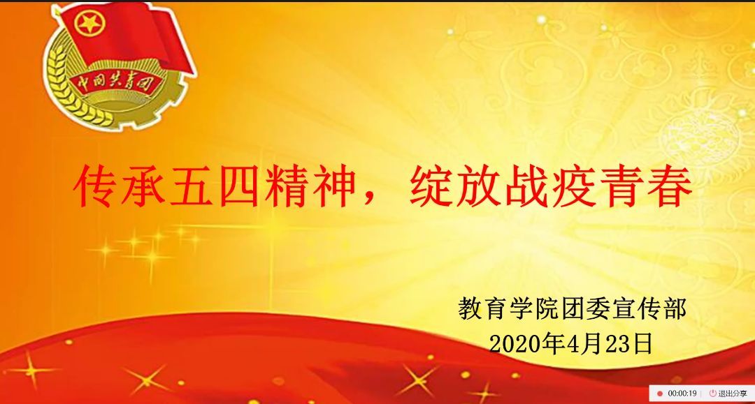 为进一步传承弘扬好伟大的“五四”精神,着力增强我院青年大学生的政治意识、大局意识、组织意识、奉献意识、先锋意识,培养青年大学生践行社会主义核心价值观,教育学院团委学生会于4月23日下午16:30以网络直播的形式开展了以“传承‘五四’精神,绽放战‘疫’青春”为主题的团日活动。学院团委书记黄志兴、全体院干及各党支部学生党员参加了本次活动。团日活动由学生会主席团成员严敏娴主持。
