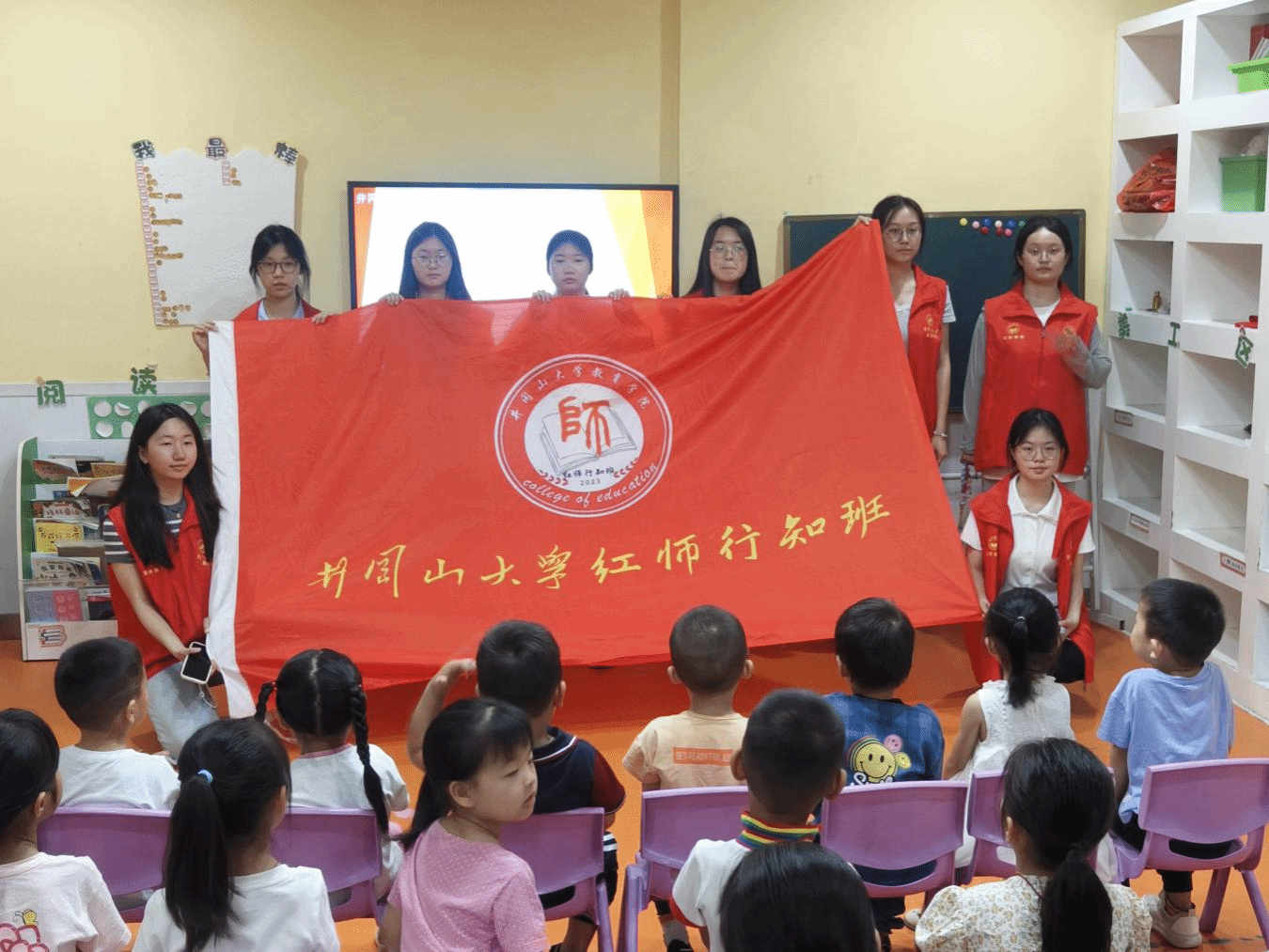 为传承红色基因,厚植幼儿爱国情怀,教育学院红师行知班于5月15日赴凌波渡社区开展红色故事主题宣讲活动。通过情景导入、互动讲述、角色扮演等多元形式,志愿者们带领20余名幼儿穿越历史时空,让他们在一个个红色故事中感受到小英雄的勇敢与担当。