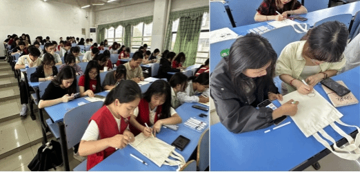 活动伊始,红心筑梦社团理事长向同学们介绍了“绘梦童行,帆布传情”公益绘画活动的目的与意义。接着,由工作人员为同学们发放帆布包和画笔,同学们根据自己的创意和想法,在纯白帆布包上自由创作,为沙芜小学的学生送上承载着爱与祝福的帆布包,传递温暖与希望。